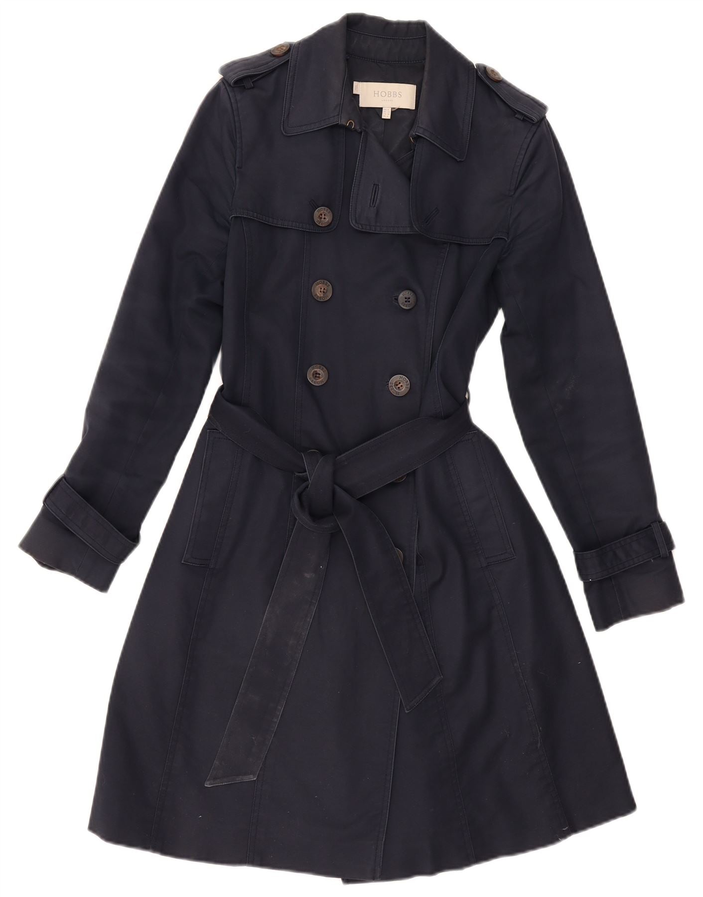 - AI Description: This Hobbs womens trench coat is presented in a classic navy blue woven fabric. It features a collared neckline and a doublebreasted button closure. Long sleeves and a regular fit offer a timeless silhouette. The belted waist cinches for a flattering shape. Tonal buttons add a refined touch. This coat combines classic style with practical elegance for any occasion.
