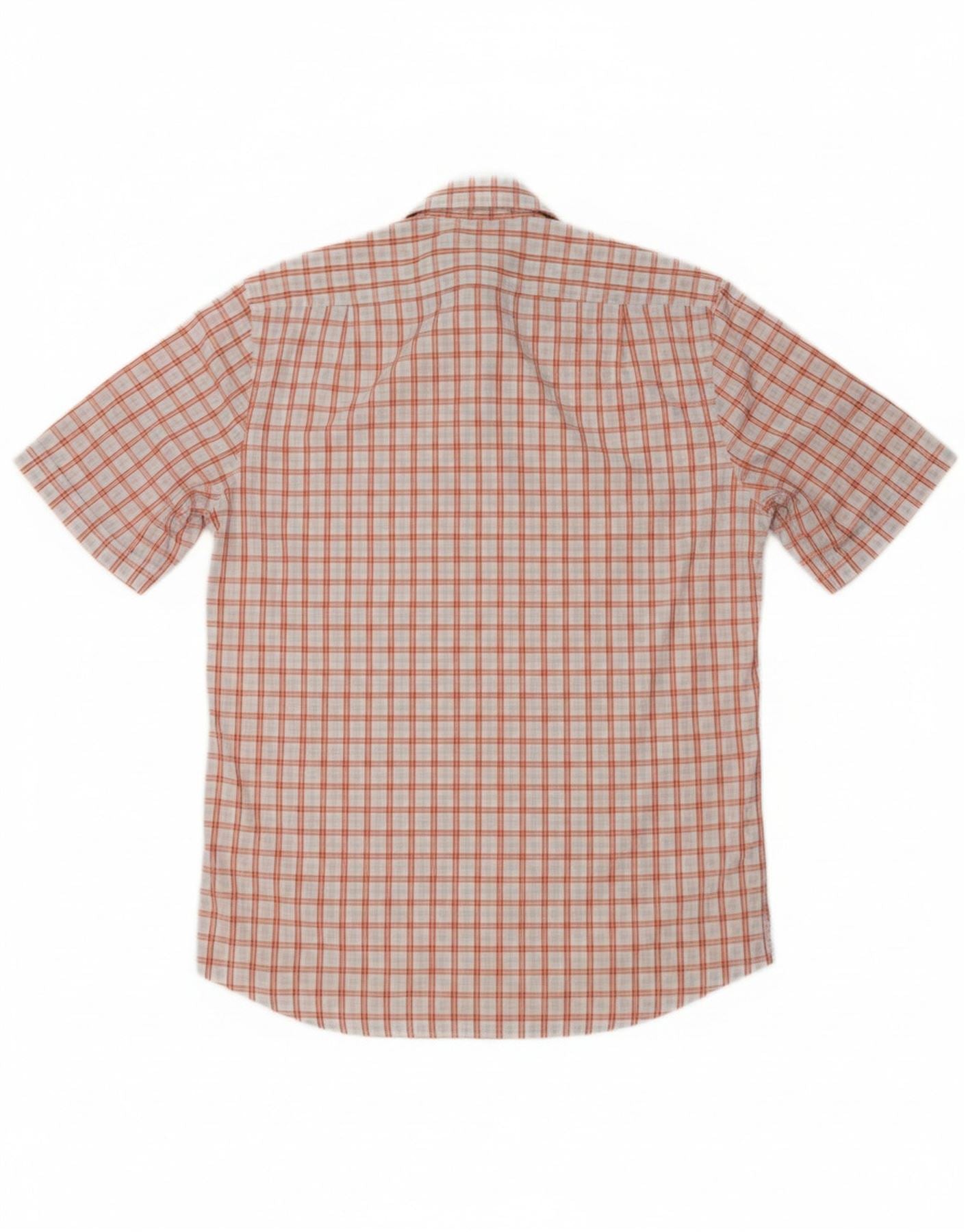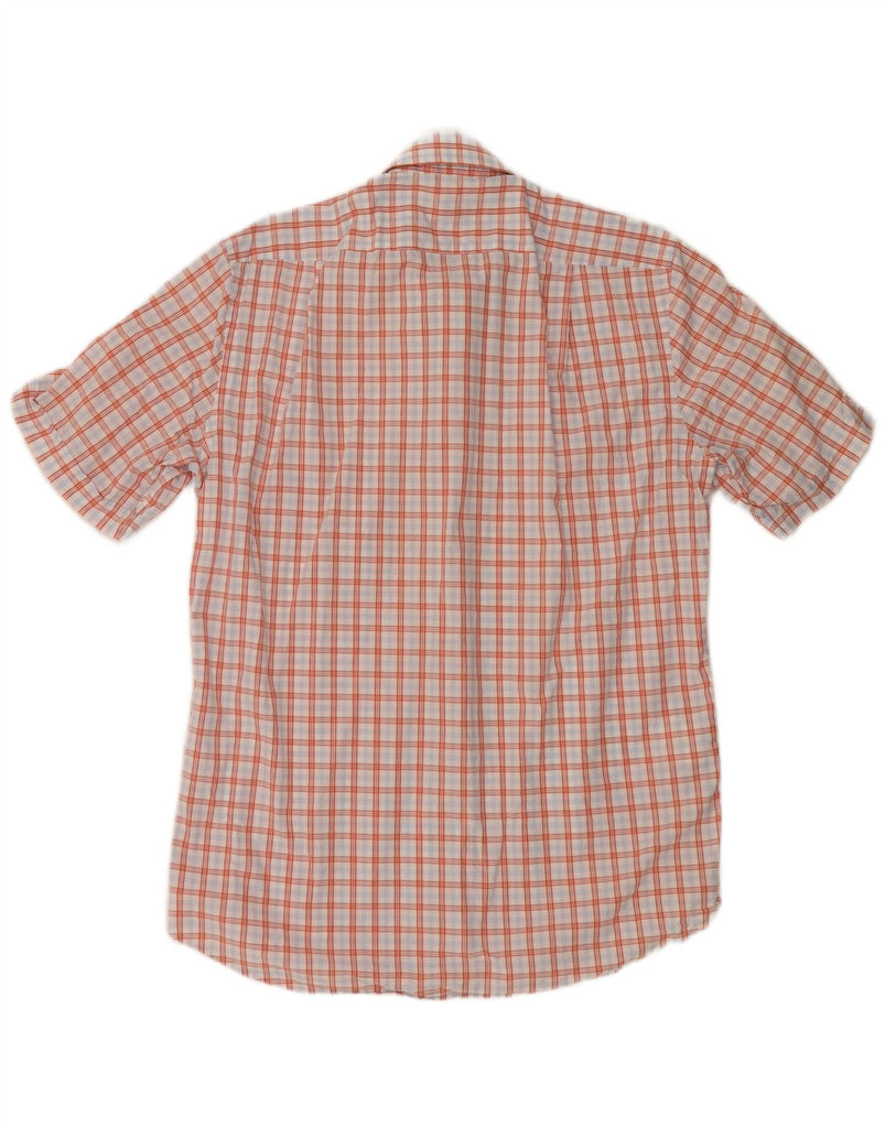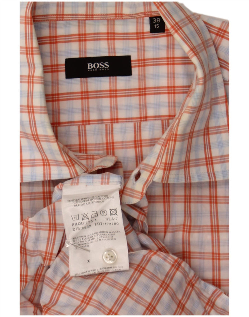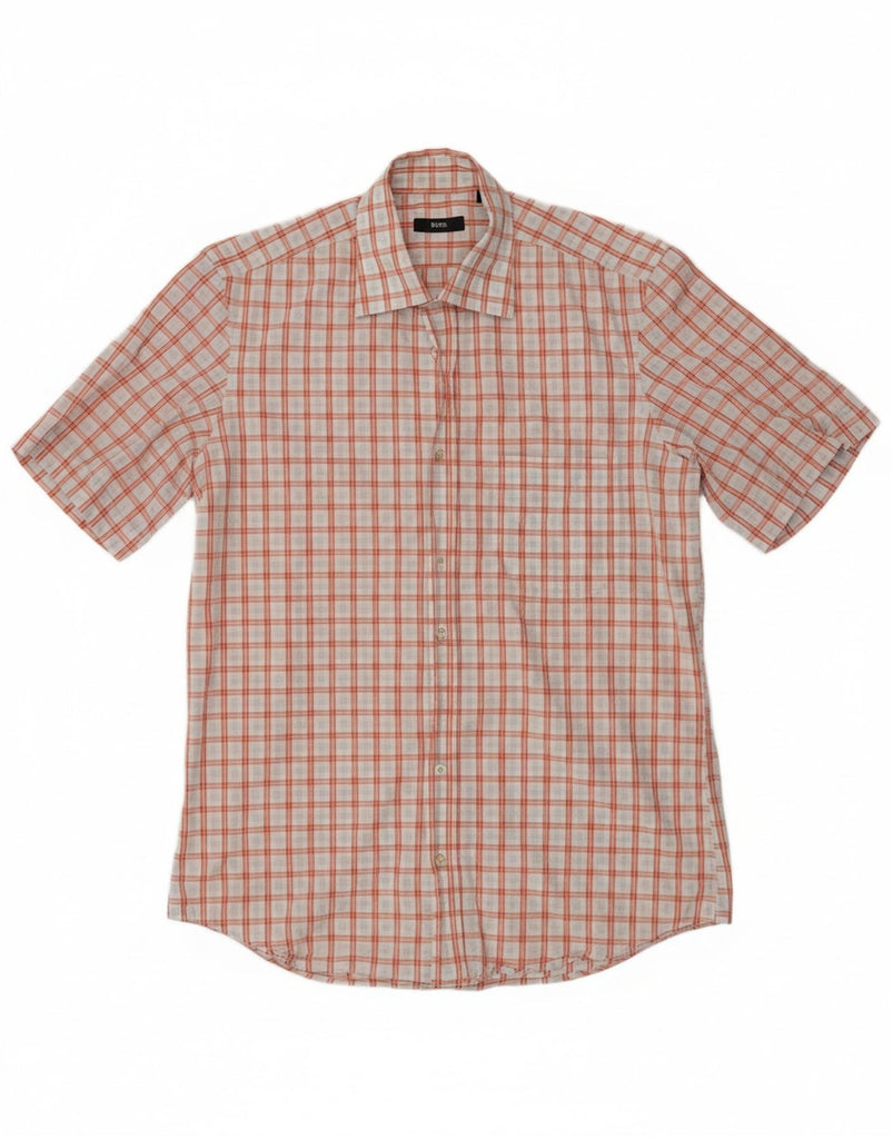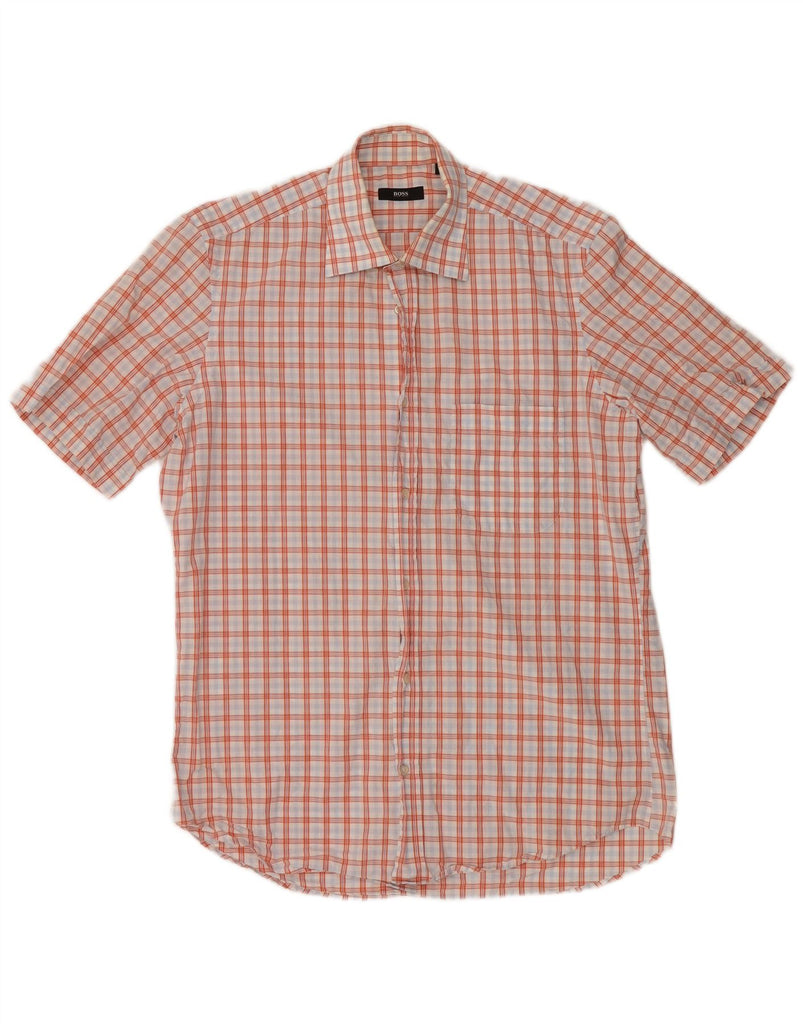 HUGO BOSS Mens Short Sleeve Shirt UK 15 38 Medium Orange Check Cotton