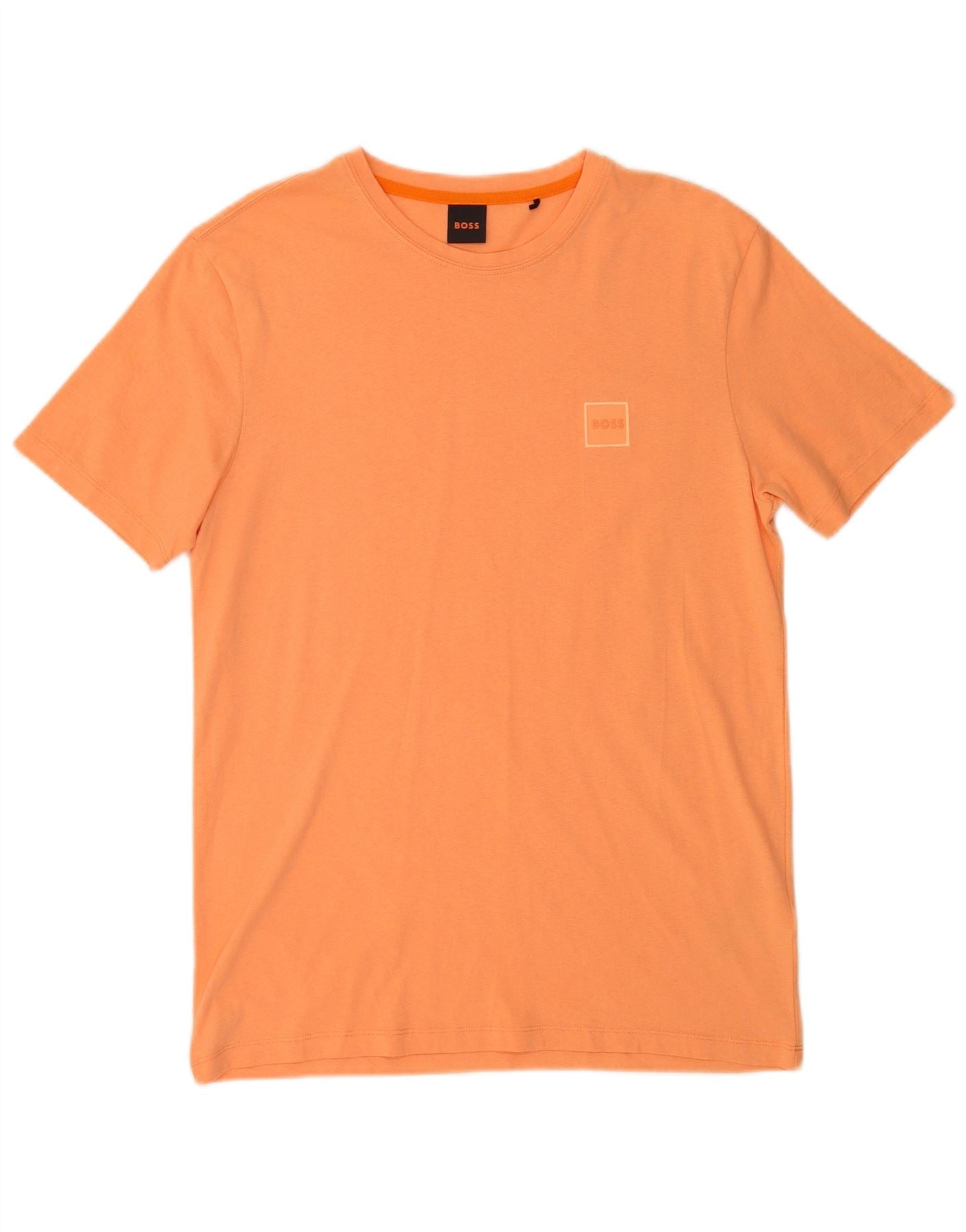 - AI Description: This Hugo Boss mens Graphic T-Shirt Top is crafted from soft orange jersey fabric. It features a classic round neck and comfortable short sleeves. The regular fit ensures ease of movement and a relaxed silhouette. A subtle tonal BOSS logo is embossed on the chest, adding a refined brand accent. This pullover style offers effortless comfort and a clean, modern aesthetic.