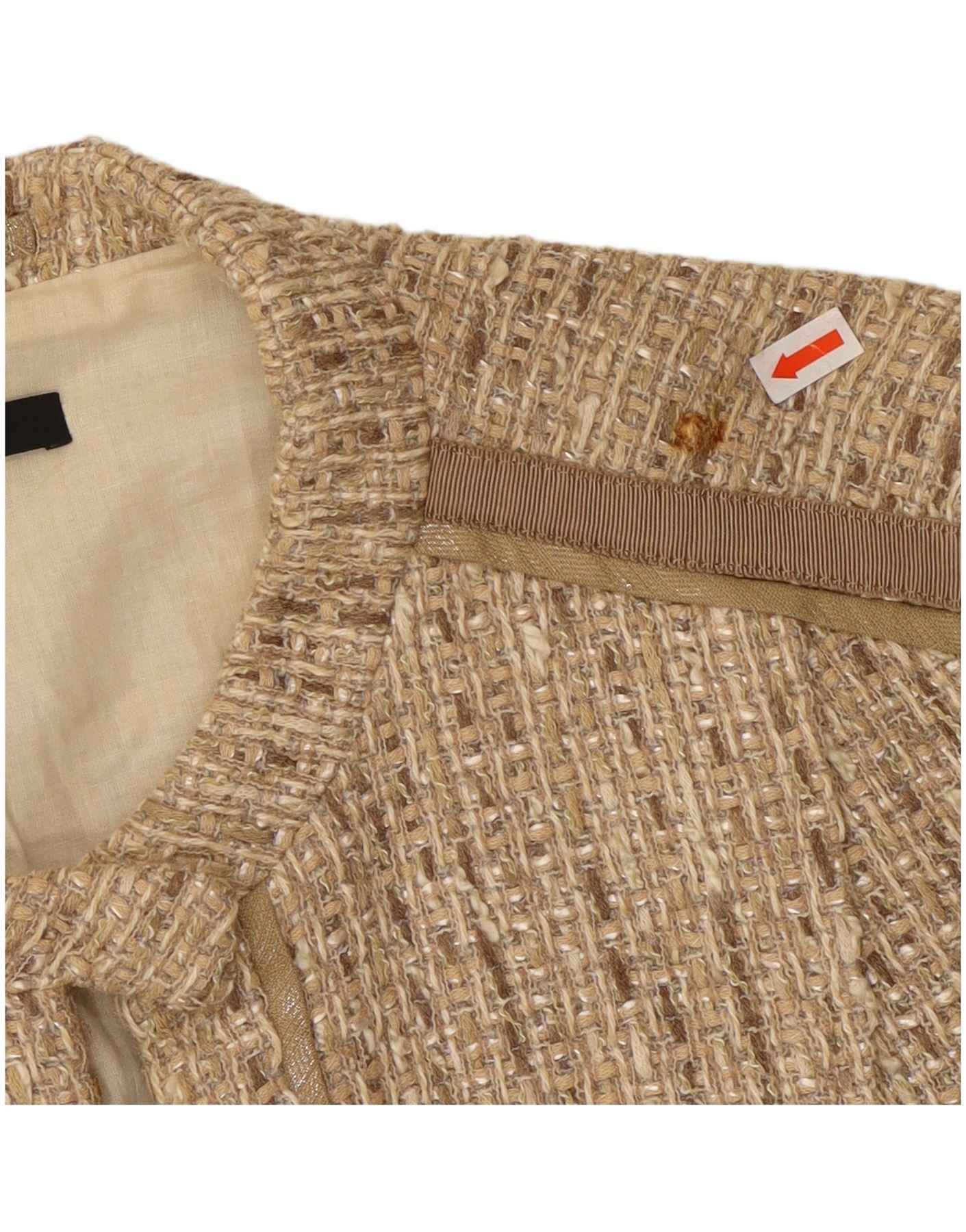 - AI Description: This Hugo Boss womens coat is crafted from a beige blended fabric with a distinctive tweed weave. It features a smooth viscose lining. The coat has a round neckline and 3/4 length sleeves. A regular fit offers comfortable wear. It fastens with a discreet hook and eye closure. A matching tie belt cinches the waist for a defined silhouette. Practical pockets complete the design.
