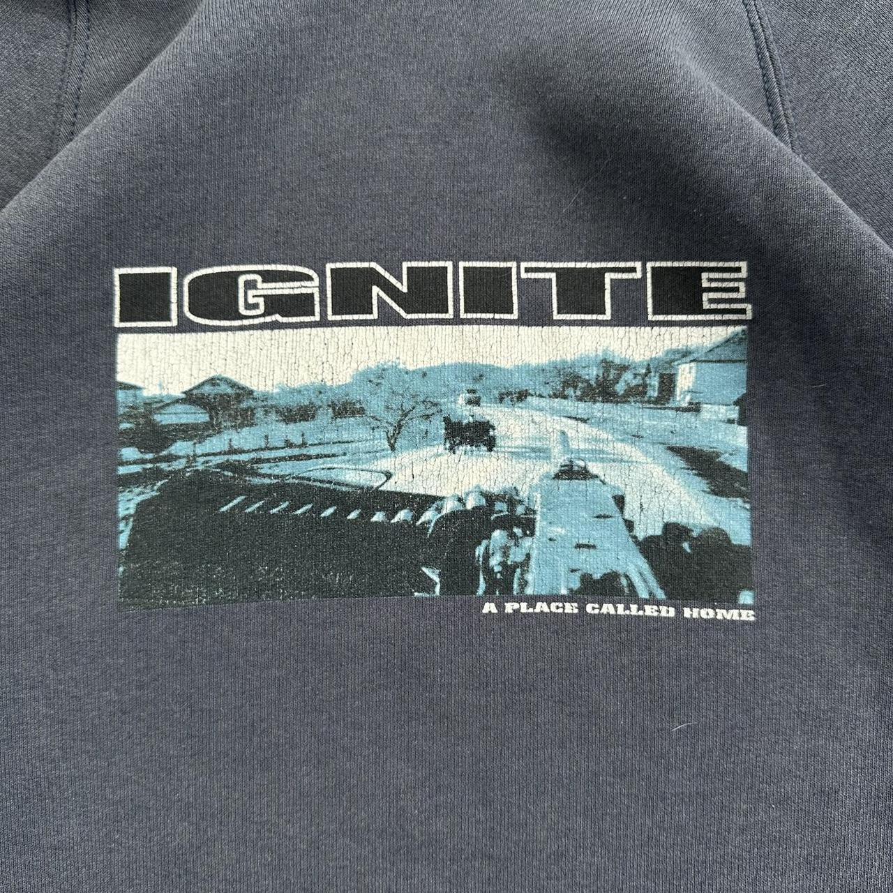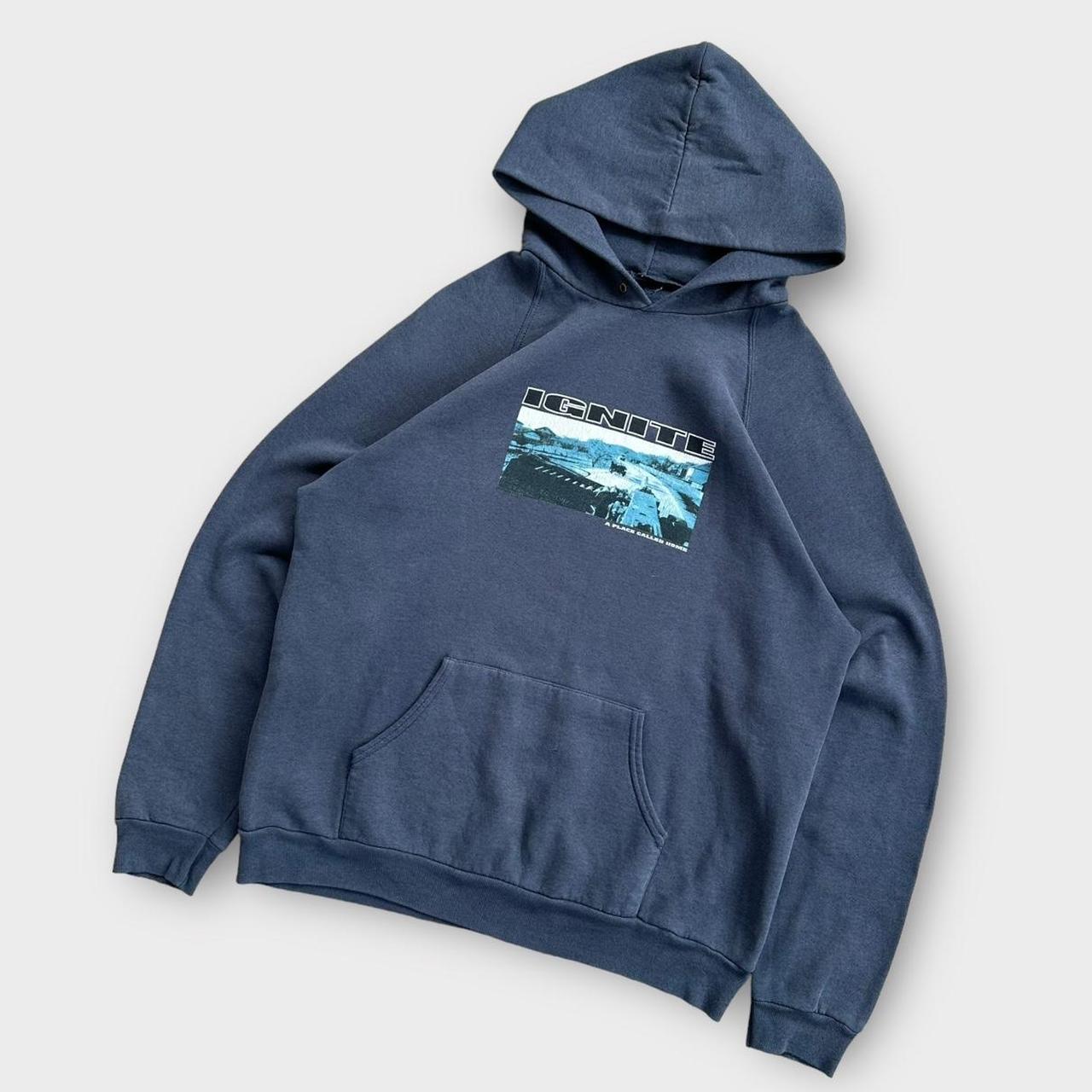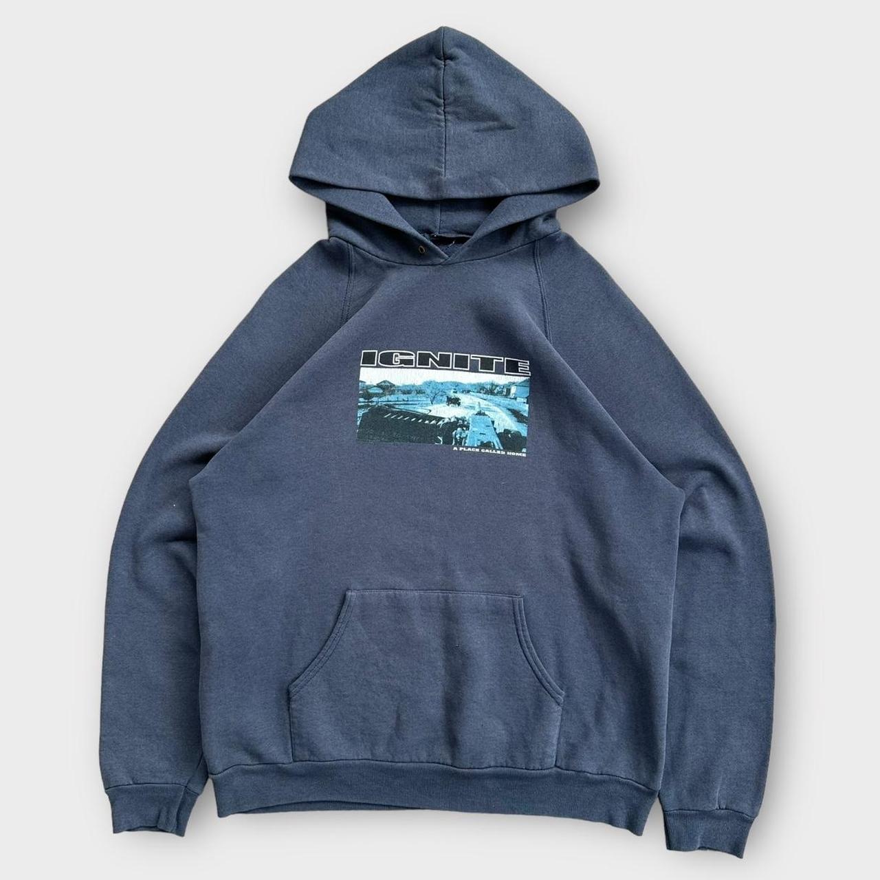 From the year 2000, A Place Called Home Ignite band merch hoodie in a faded blue/ navy colour with graphic print on the front