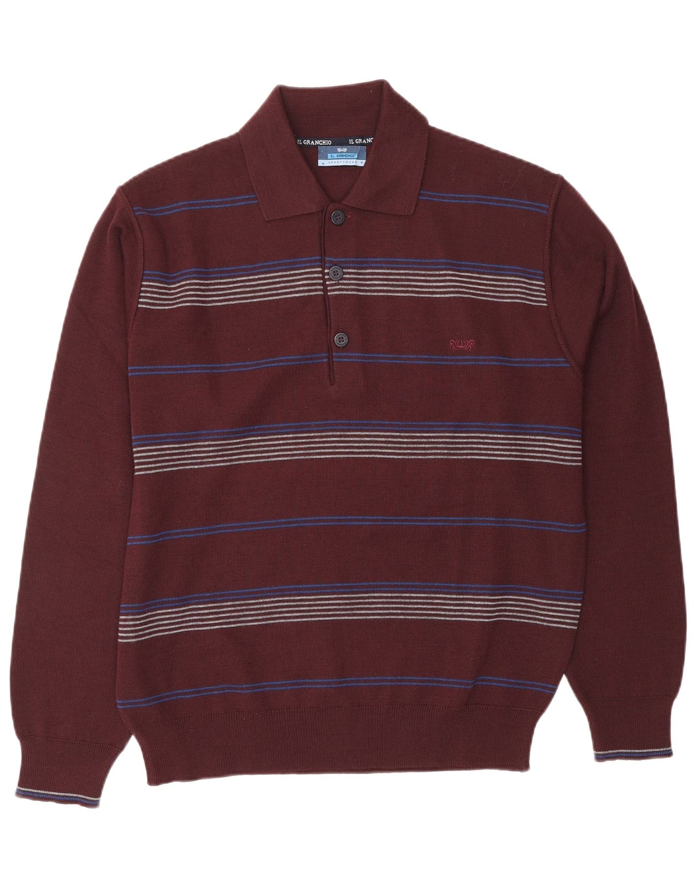 IL GRANCHIO Mens Polo Neck Jumper Sweater Large Maroon Striped Wool