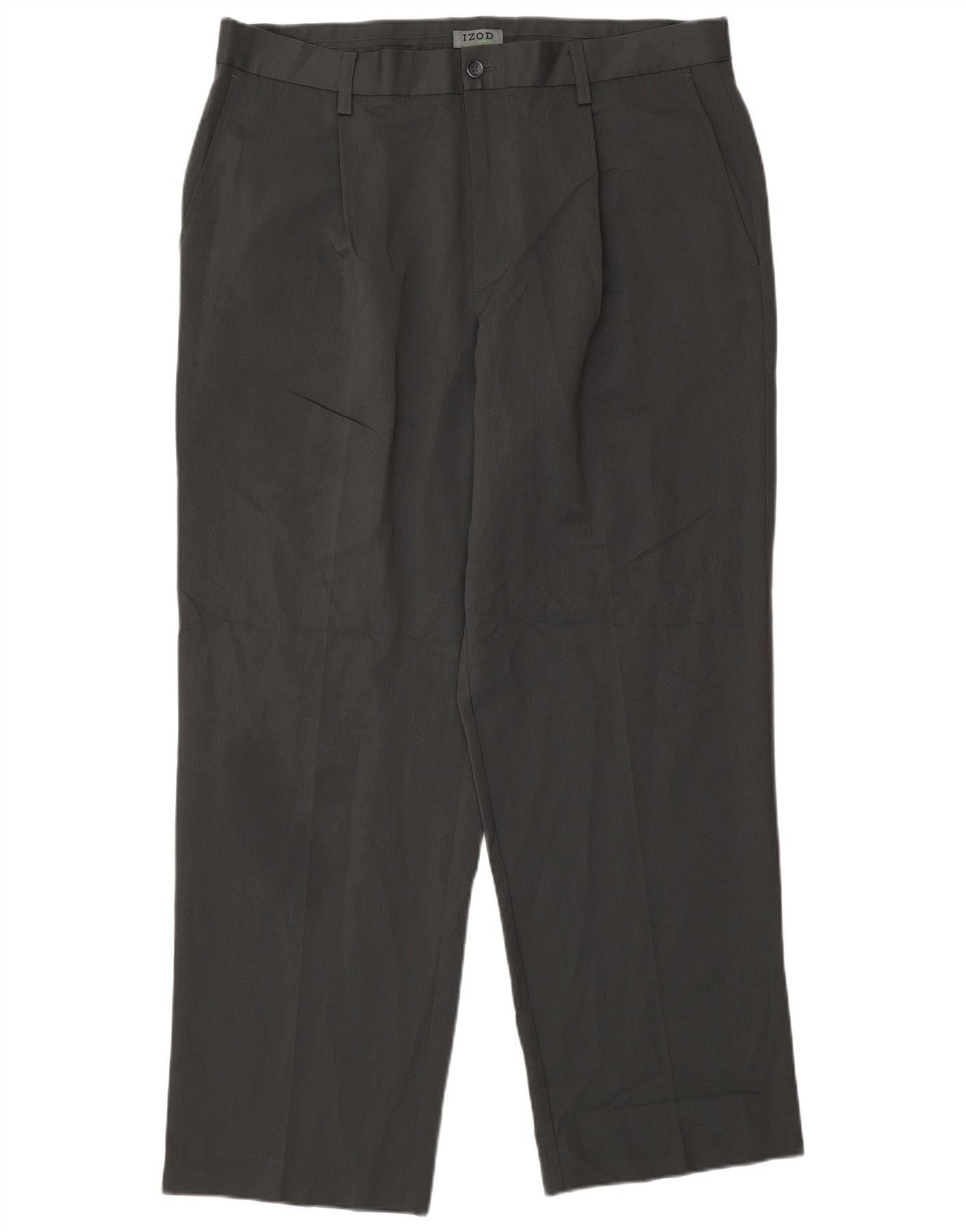- AI Description: This Izod mens suit trousers are crafted from a grey woven fabric, featuring a subtle pinstripe pattern. They offer a regular fit with straight legs, ensuring a classic silhouette. The trousers include a button closure and practical pockets. This design provides a smart, professional look suitable for various occasions.