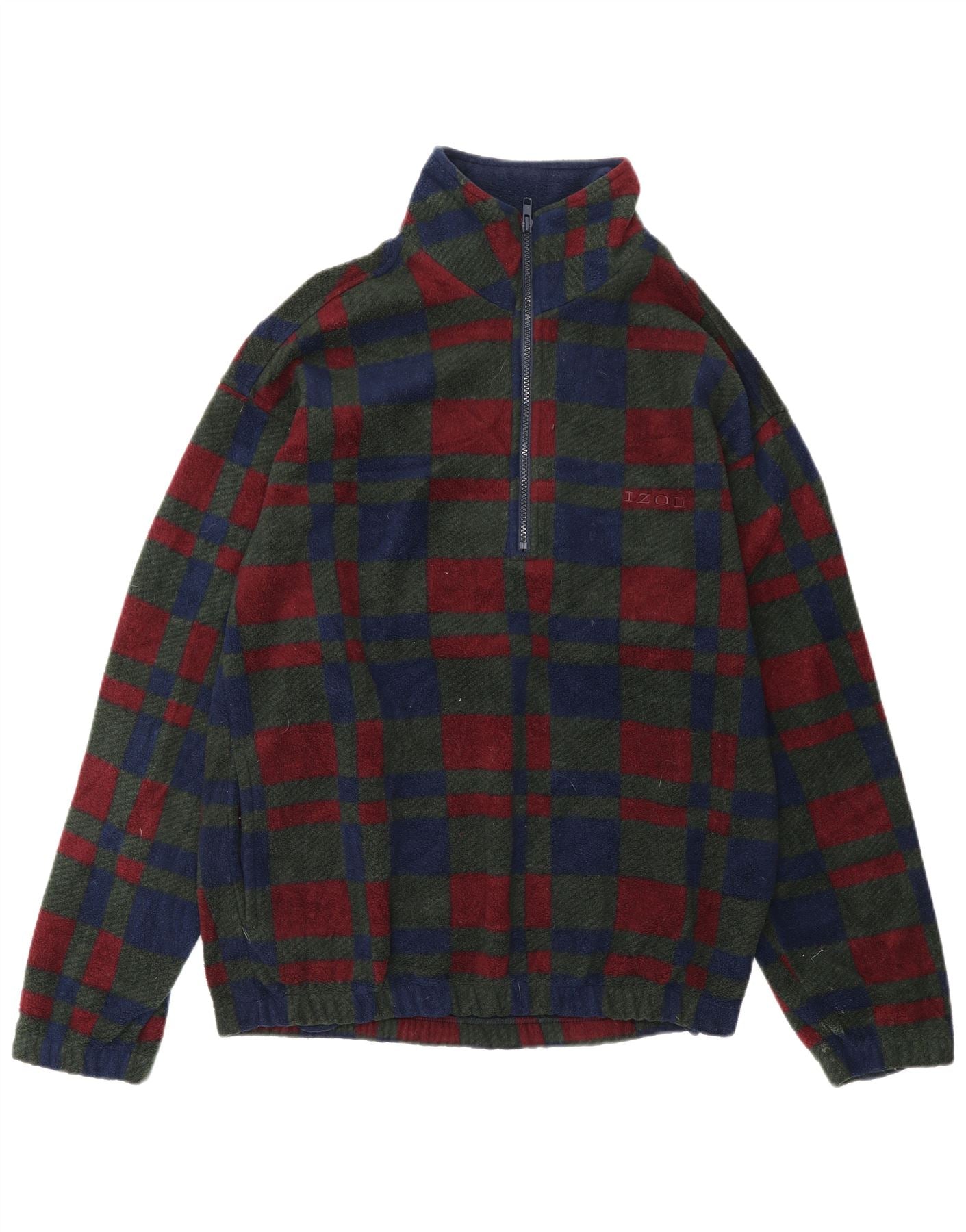 - AI Description: This Izod mens sweatshirt jumper is crafted from soft 100 percent polyester fleece. It features a classic plaid pattern in rich multicoloured tones of green, navy blue, and burgundy. The high neck and quarter zip closure offer versatile styling and thermal comfort. Long sleeves and a regular fit ensure a comfortable silhouette. This classic style provides warmth and a timeless look.