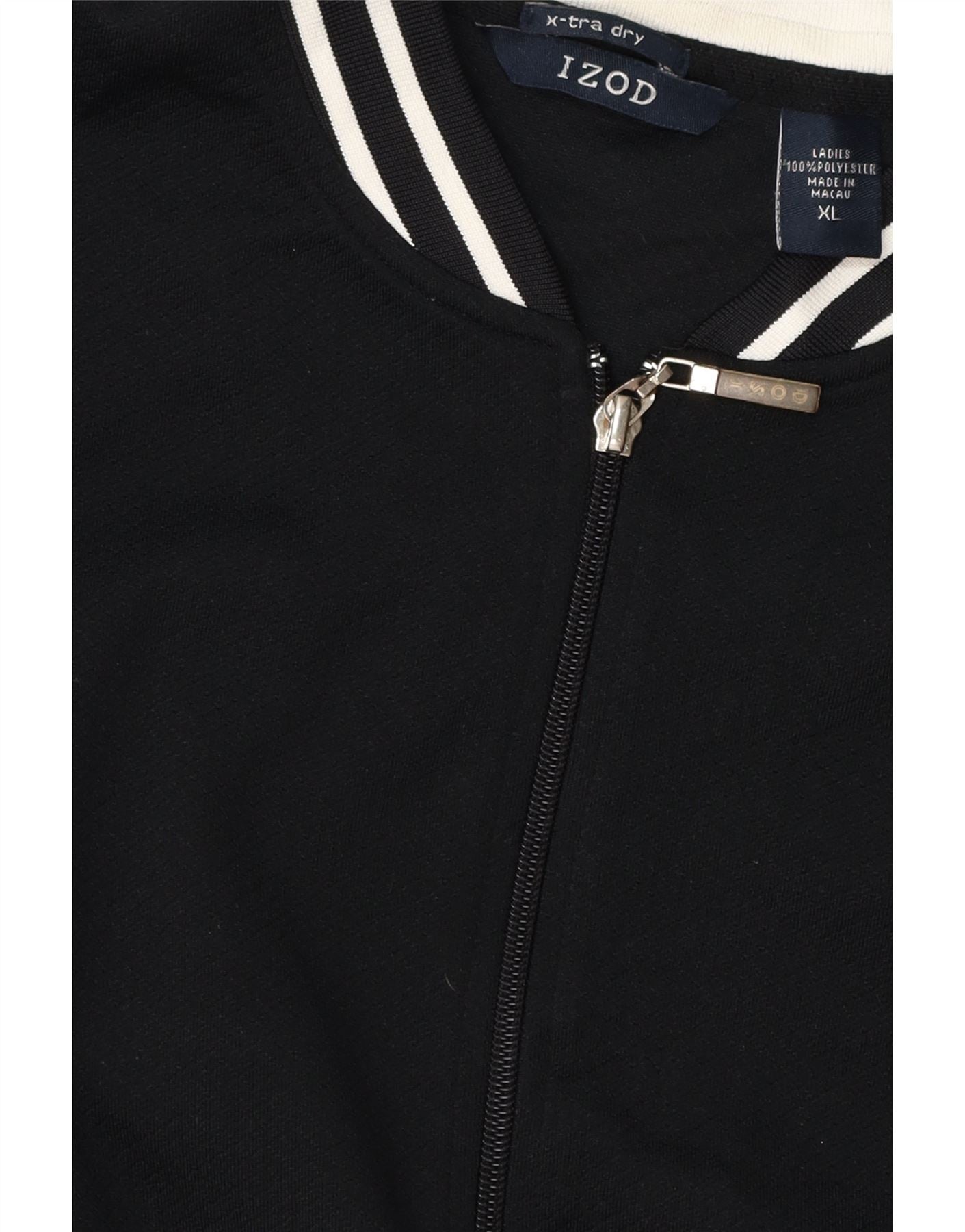 - AI Description: This Izod womens bomber jacket is crafted from black 100 percent polyester knit fabric. It offers a breathable, smooth texture. The collared neckline and full zip closure define its sporty silhouette. Long sleeves feature striped cuffs. A subtle logo accent adds brand recognition. The regular fit ensures comfortable wear, perfect for a casual sports style.