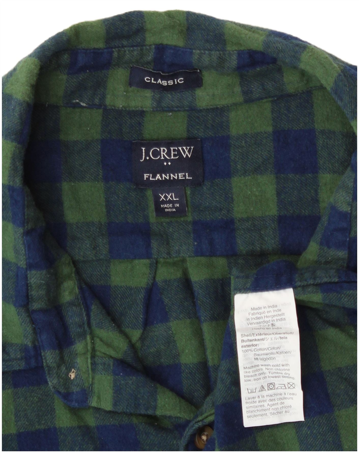 - AI Description: This J. Crew mens Flannel Shirt is crafted from soft 100 percent cotton flannel. It features a classic green and navy blue plaid pattern. The collared neckline and button closure offer a timeless look. Long sleeves and a classic fit ensure comfortable wear. A single chest pocket adds practical detail. This shirt is perfect for a casual, refined style.
