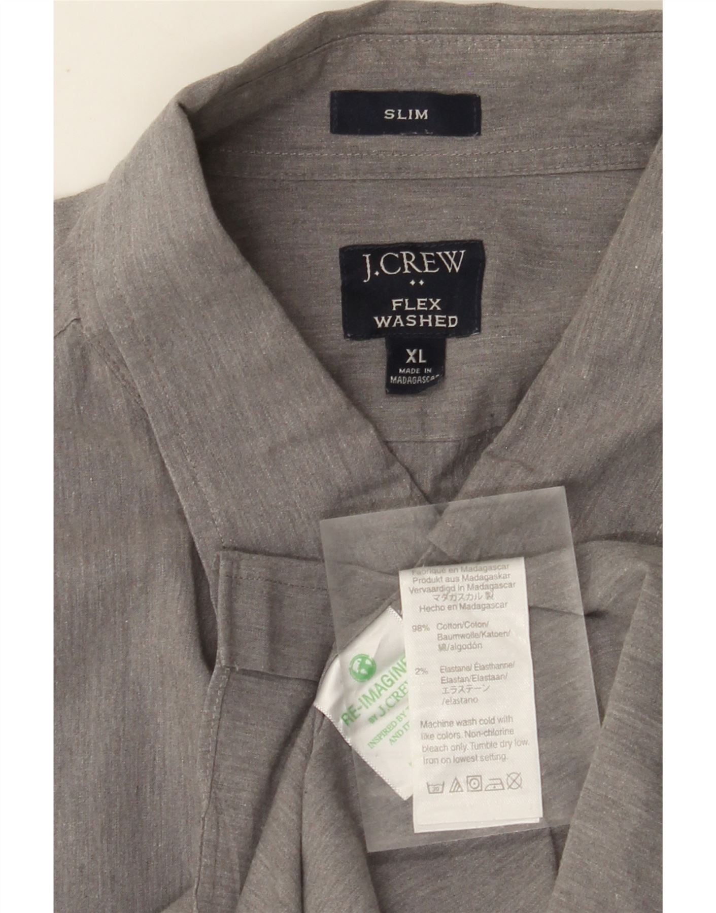 - AI Description: This J Crew mens shirt is crafted from a grey cotton blend fabric, offering a comfortable stretch. It features a classic collared neckline and long sleeves with buttoned cuffs. The slim fit provides a modern, tailored silhouette. A single chest pocket adds practical detail. The button-up front ensures a neat finish, perfect for smart casual wear.