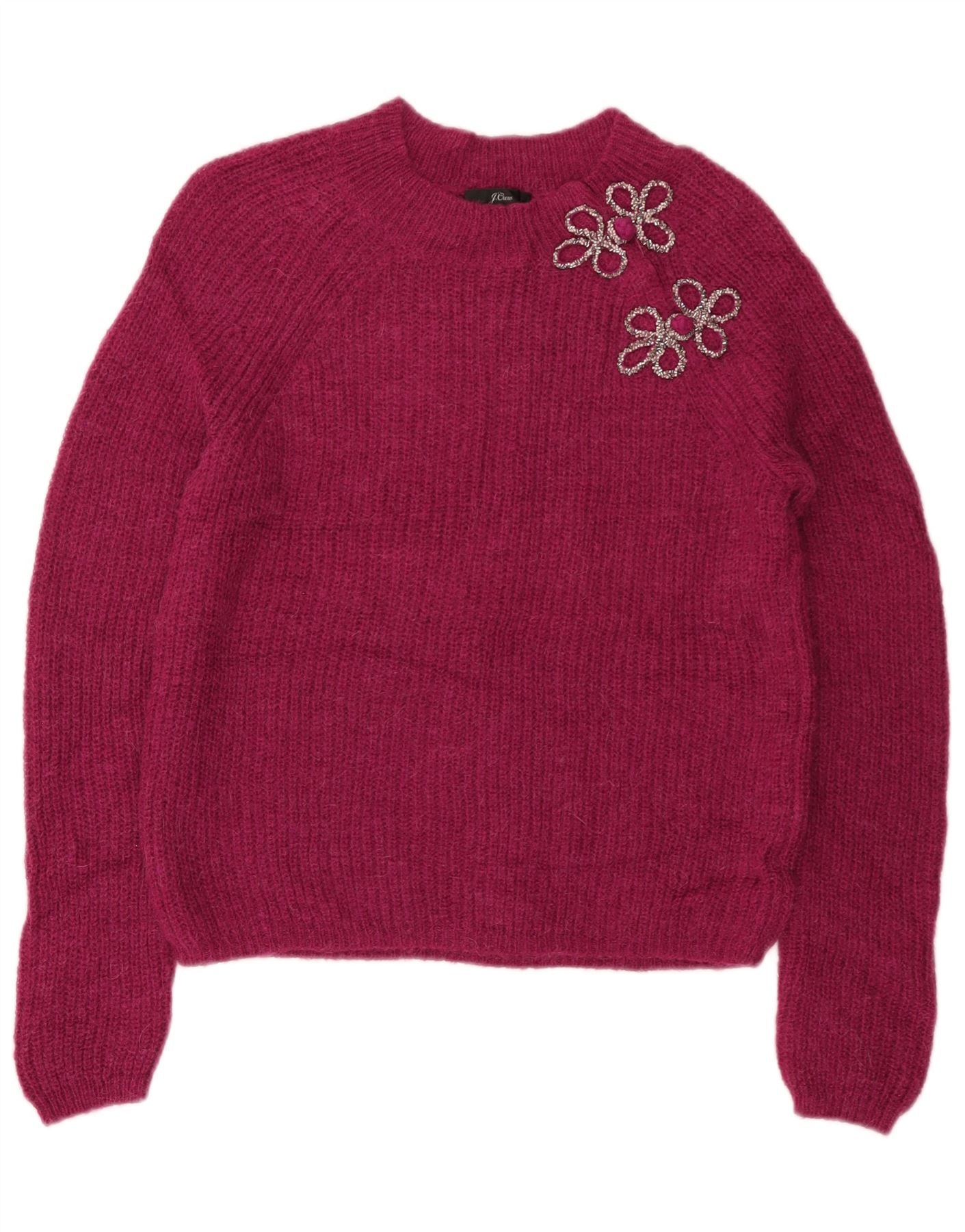 - AI Description: This J. Crew womens crew neck jumper sweater is crafted from a luxurious knit blend of polyamide, acrylic, wool, and alpaca. It offers a soft, textured feel in a rich pink hue. The round neckline and long sleeves provide a classic silhouette. Its regular fit ensures comfortable wear. Beaded floral accents adorn the front, adding a distinctive graphic detail. This pullover style is perfect for sophisticated layering.