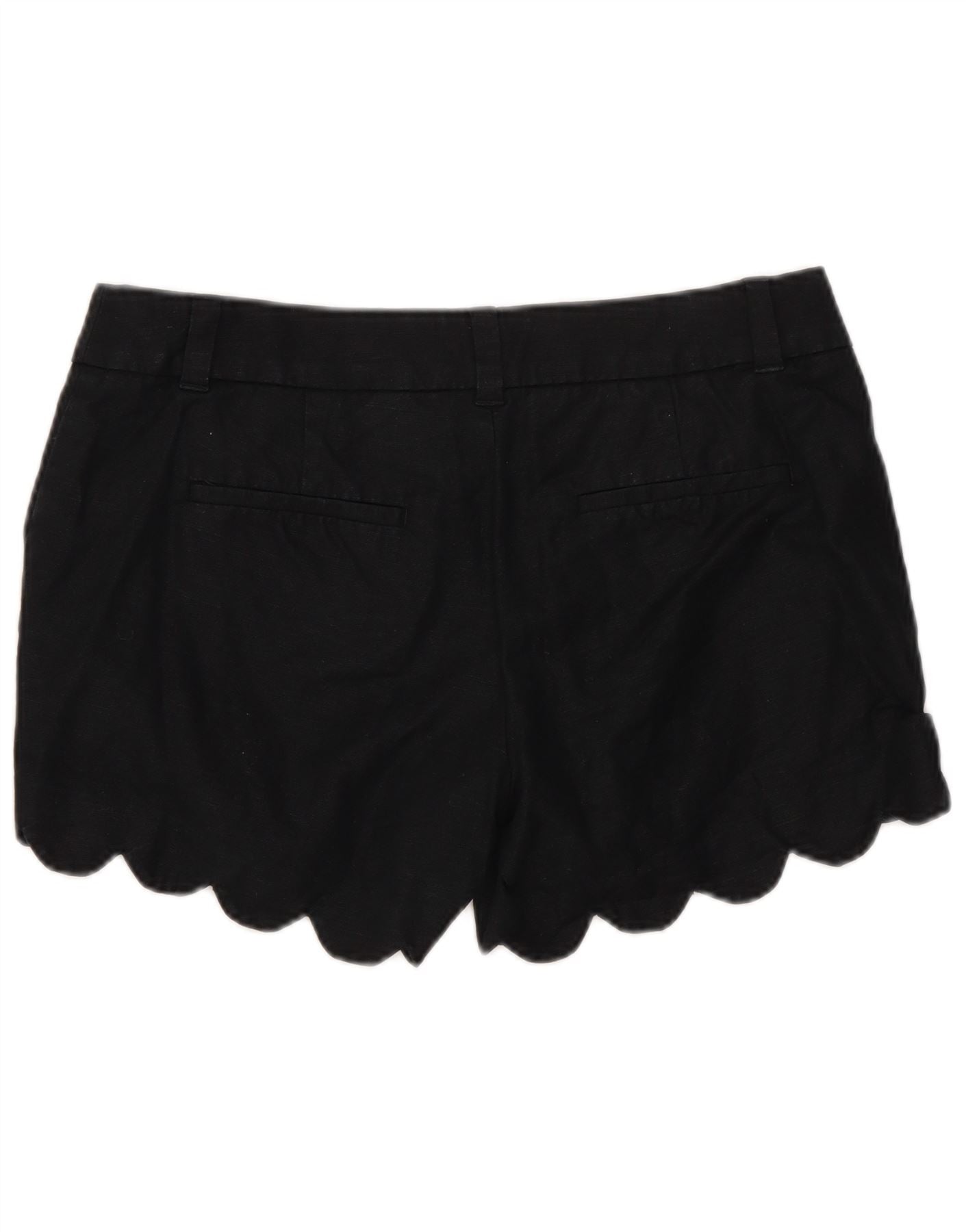- AI Description: These J. Crew womens casual shorts are crafted from a comfortable linen and cotton blend fabric. They feature a regular fit and a practical zip closure. The design includes functional pockets for convenience. A distinctive scalloped hemline adds a charming, unique touch to the silhouette. The classic black colour ensures versatile styling for various occasions. These shorts offer both comfort and a touch of stretch for ease of movement.