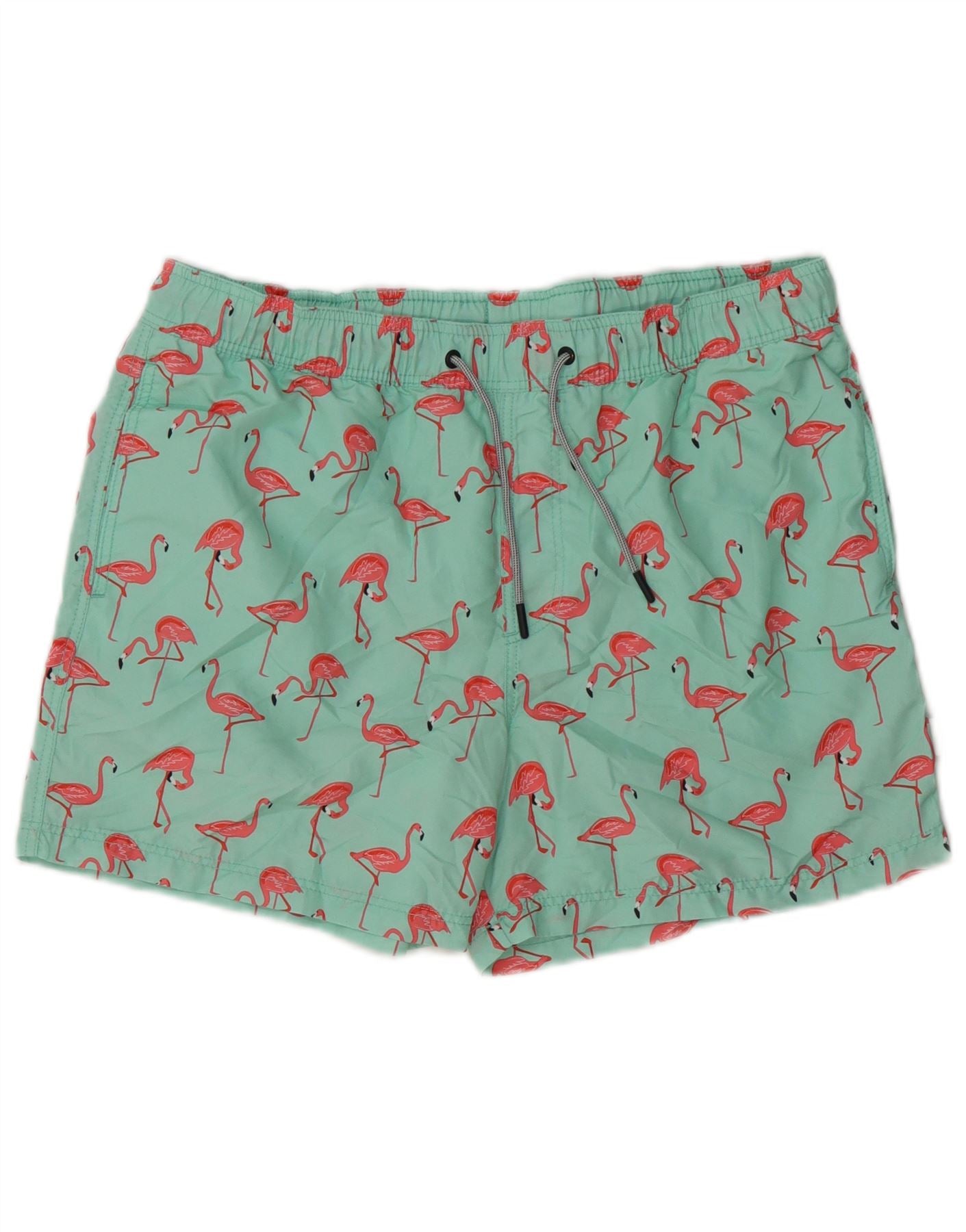 - AI Description: This Jack and Jones mens shorts are crafted from lightweight, woven 100 polyester fabric. They feature a vibrant turquoise base with an all-over pink flamingo animal print. The regular fit and elasticated waist ensure comfort. A drawstring closure provides an adjustable fit. Practical pockets are included. The shorts are also lined for added comfort. A subtle brand logo adds a finishing touch.