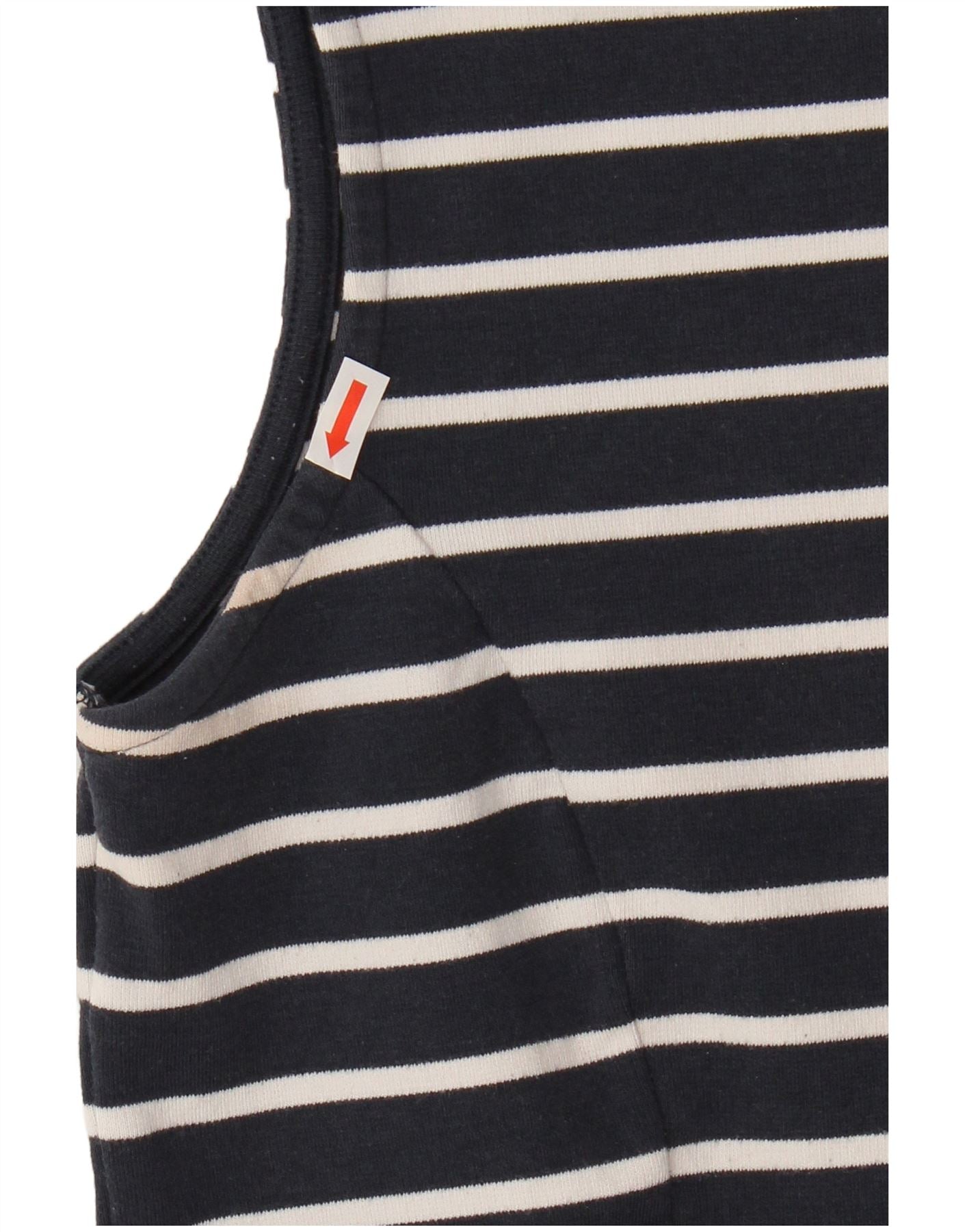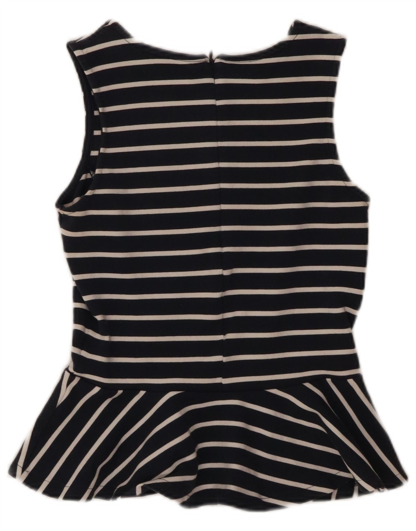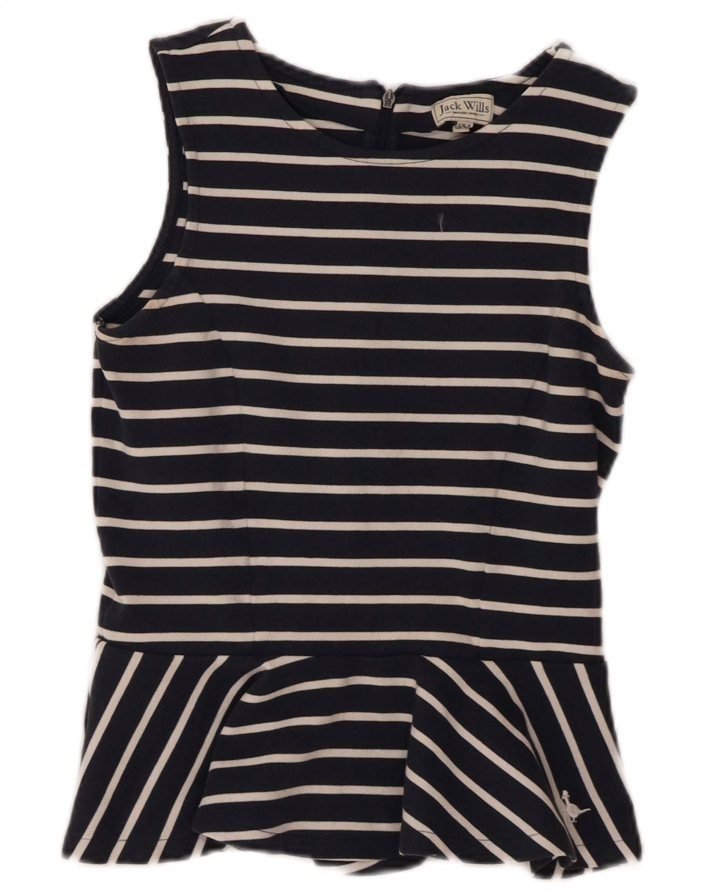- AI Description: This Jack Wills womens Vest Top is crafted from soft navy blue jersey fabric. It features a classic striped pattern in white. The sleeveless design and round neck offer a clean silhouette. A flattering peplum hem adds a stylish flare. It has a regular fit and a zip closure at the back. A subtle logo accent completes the look.