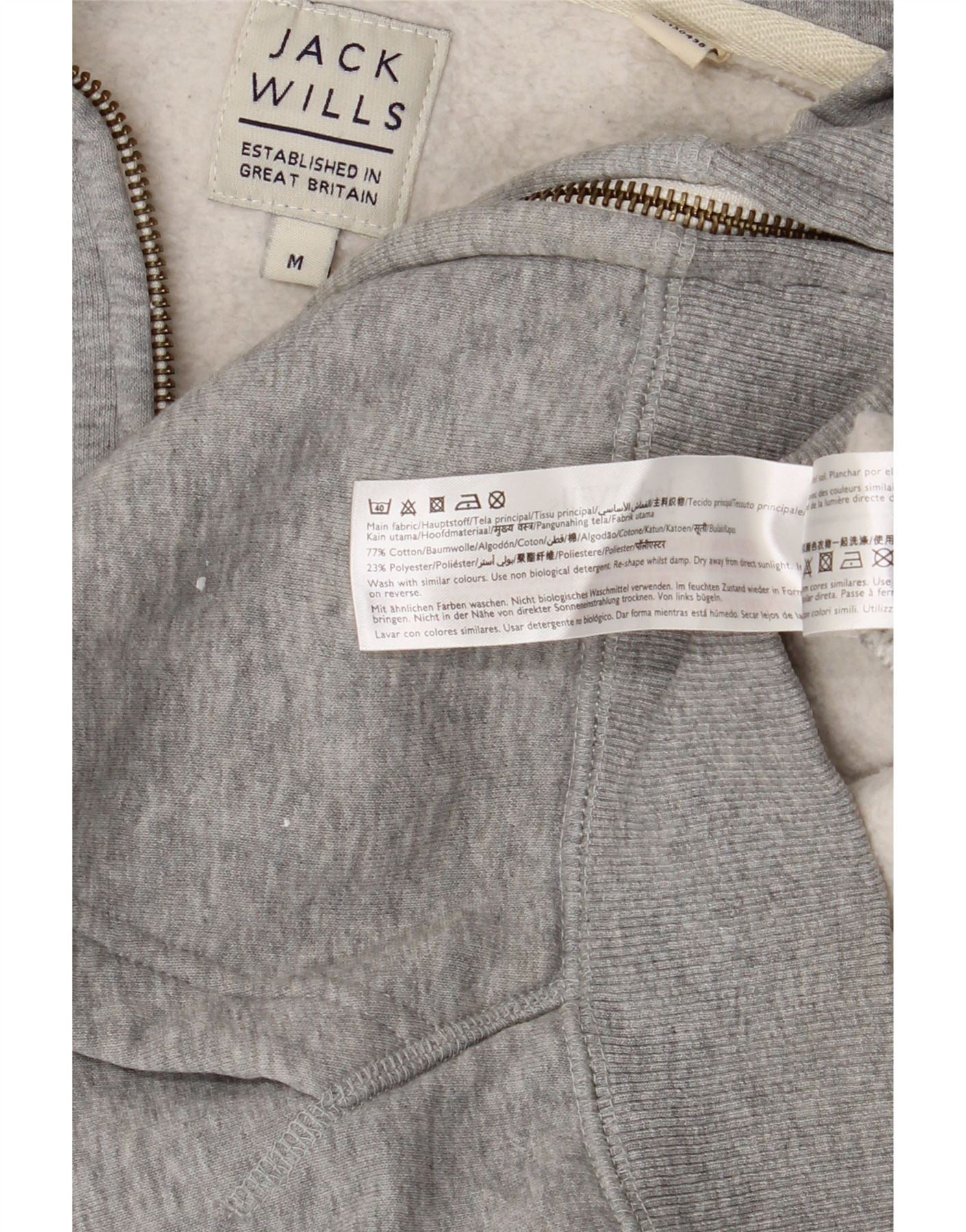 - AI Description: This Jack Wills womens Zip Hoodie Sweater is crafted from a soft grey cotton blend fabric. It features a full zip closure and a comfortable hooded design. Long sleeves and a regular fit ensure ease of wear. The front displays a subtle JW logo, while the back features a prominent WILLS graphic. Practical pockets complete this versatile college style piece.