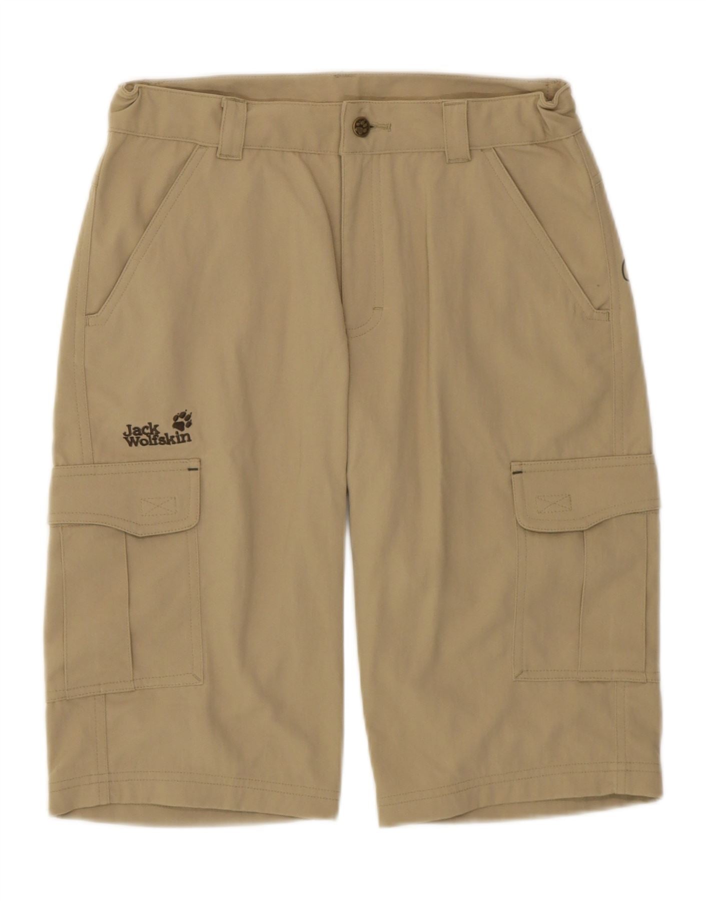 - AI Description: These Jack Wolfskin boys' cargo shorts are made from woven fabric in a versatile khaki colour. They feature a classic style with a button closure and an adjustable waist for a comfortable fit. The regular fit allows for ease of movement, ideal for hiking and outdoor activities. These shorts also include practical pockets.