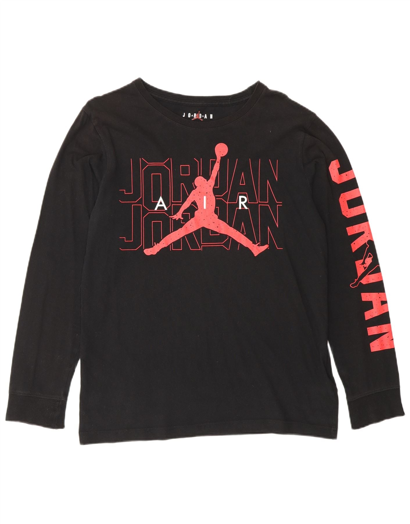 - AI Description: This Jordan boys graphic long sleeve top is crafted from soft black cotton jersey. It features a classic round neck and long cuffed sleeves. The front displays a bold red Jordan logo and text graphic. A similar graphic runs down the left sleeve. The pullover design offers a comfortable regular fit, perfect for sports or casual wear.