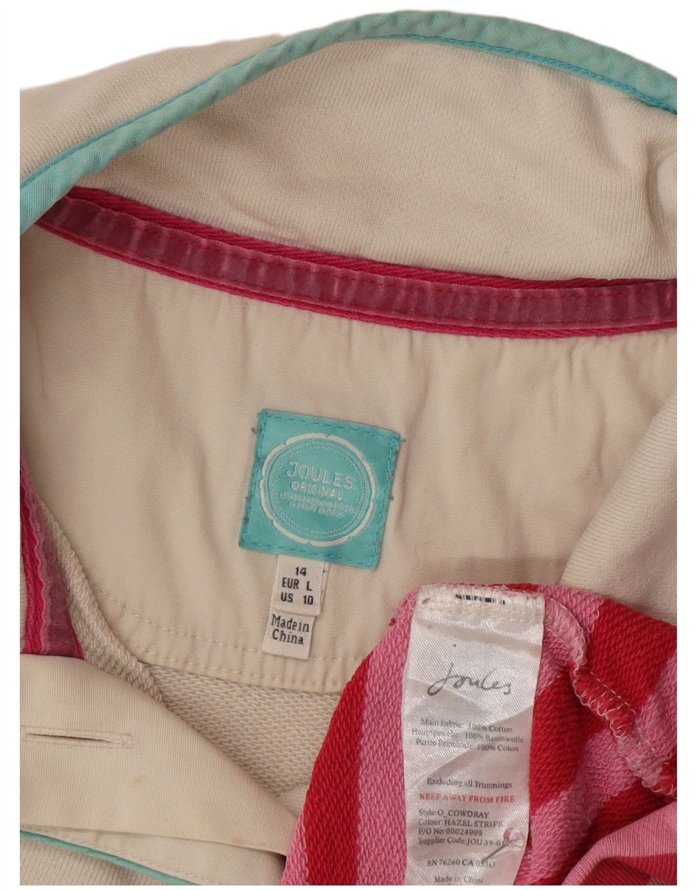 - AI Description: This Joules womens sweatshirt jumper is crafted from soft 100 percent cotton knit fabric. It features a vibrant striped pattern in off white, turquoise, and pink. The mock neck and button closure offer a classic, comfortable fit. Long sleeves complete the design. A subtle logo accent adds a signature touch. The regular fit ensures ease of wear and comfort.