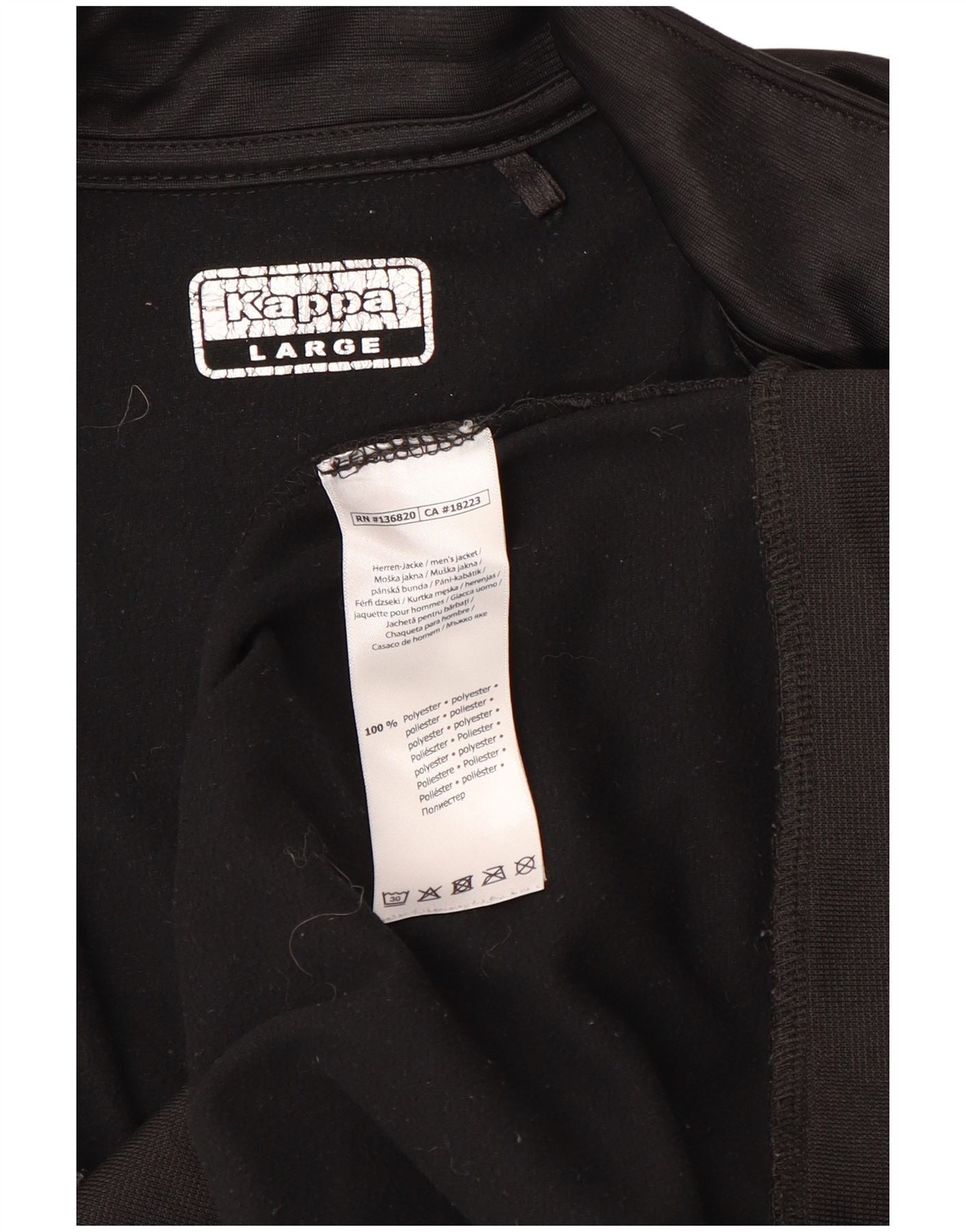 - AI Description: This Kappa mens jacket is crafted from smooth black polyester knit fabric. It features a collared neckline and a full zip closure for versatile wear. Long sleeves and a regular fit ensure comfortable movement. Prominent white Kappa logos adorn the sleeves and chest, adding a distinctive sports accent. Practical pockets complete the design, offering functional style.