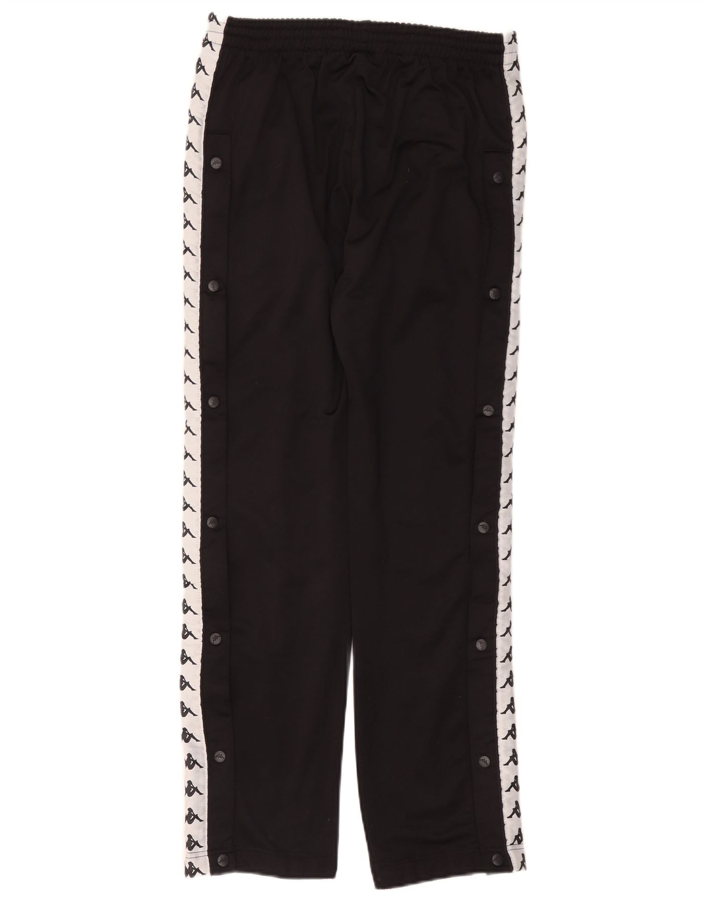 - AI Description: These Kappa mens casual trousers are crafted from smooth black polyester jersey. They feature a comfortable elasticated waist with a pull-on design. The regular fit offers a relaxed silhouette. Side pockets add practicality. Iconic white logo tape runs down each leg, providing a distinctive 90s-inspired accent. The design ensures both comfort and style.
