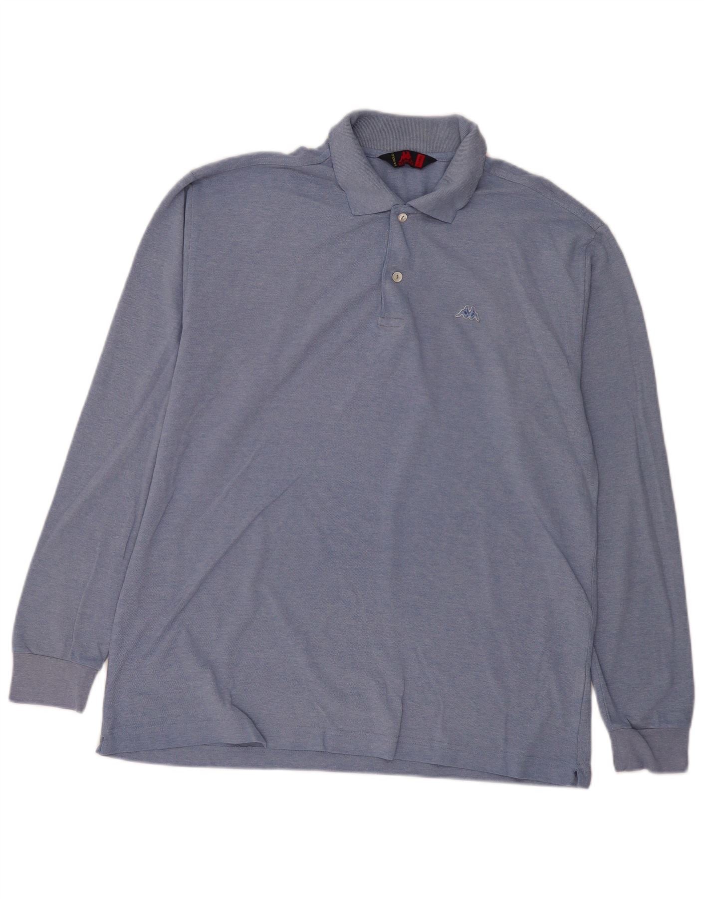 - AI Description: This Kappa mens long sleeve polo shirt is crafted from soft blue cotton jersey. It features a classic collared neckline. A two-button placket offers a refined closure. Long sleeves finish with ribbed cuffs for comfort. An embroidered Kappa logo subtly adorns the chest. Its regular fit ensures ease of movement and timeless style.