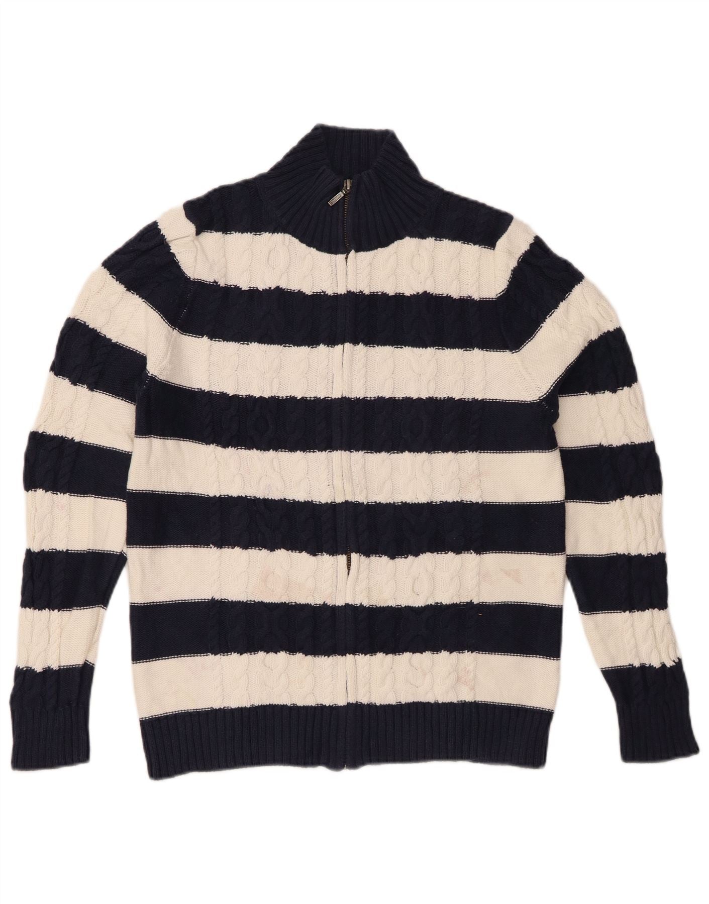 L.L.BEAN Womens Cardigan Sweater UK 14 Medium Navy Blue Striped Cotton