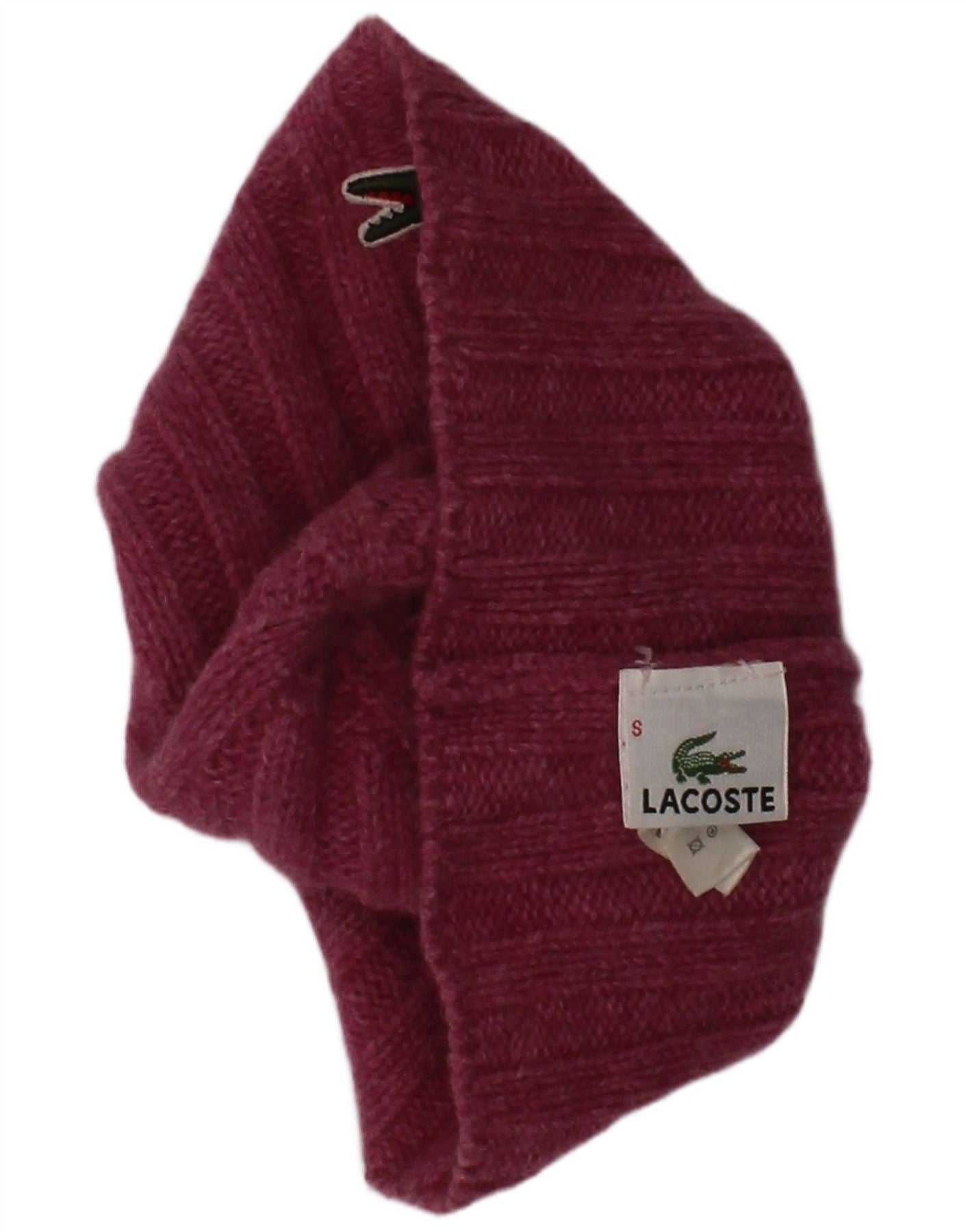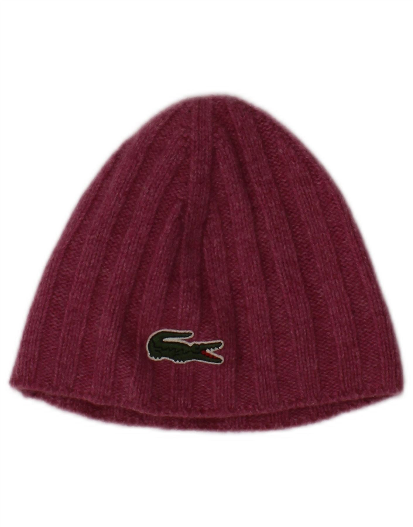 LACOSTE Womens Graphic Knit Beanie Hat Small Maroon Lambswool Classic