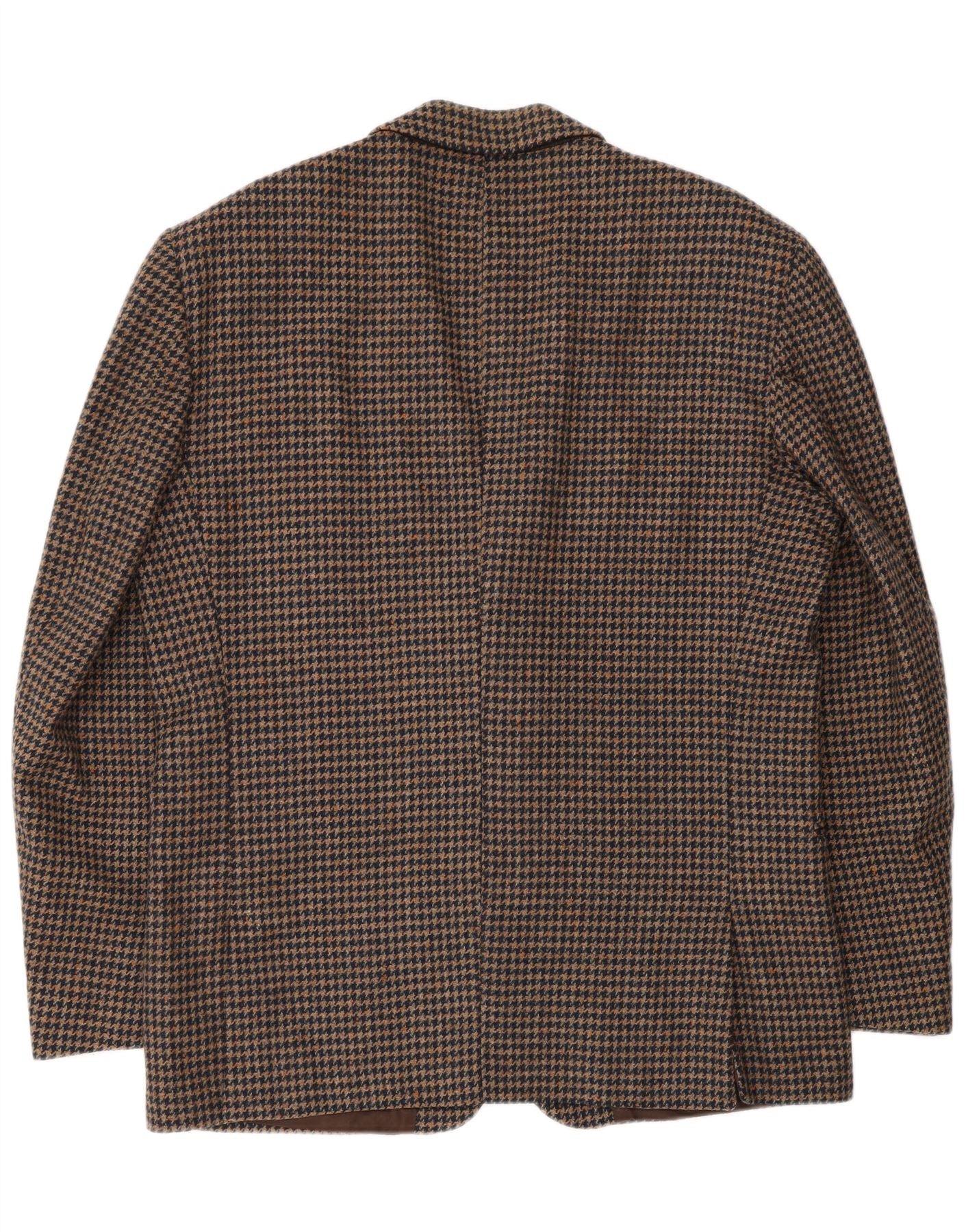 - AI Description: This Vintage mens 2 piece suit jacket is crafted from luxurious pure virgin wool tweed. It features a classic brown houndstooth pattern, offering timeless sophistication. The collared neckline and two-button front closure define its traditional structure. Long sleeves and a classic fit ensure a refined silhouette. It is fully lined and includes practical pockets, blending elegance with functionality.