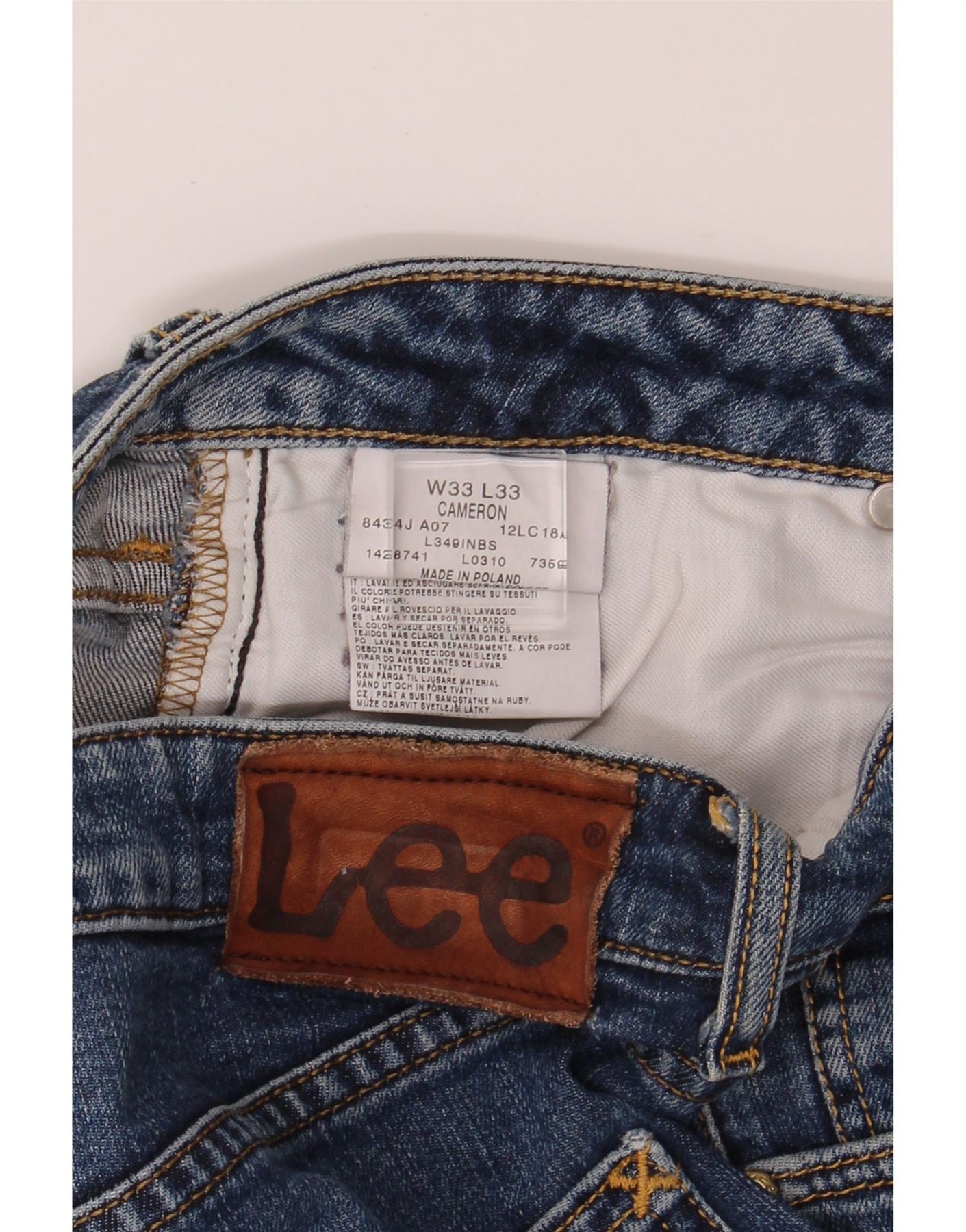 - AI Description: These classic, pre-owned Lee jeans offer a regular fit in a blue denim fabric. Featuring button closure, pockets and logo accent. Condition is good, with minor discoloration to the front thighs and visible wear on the hems. Label size W33 L33. Style: Classic.
