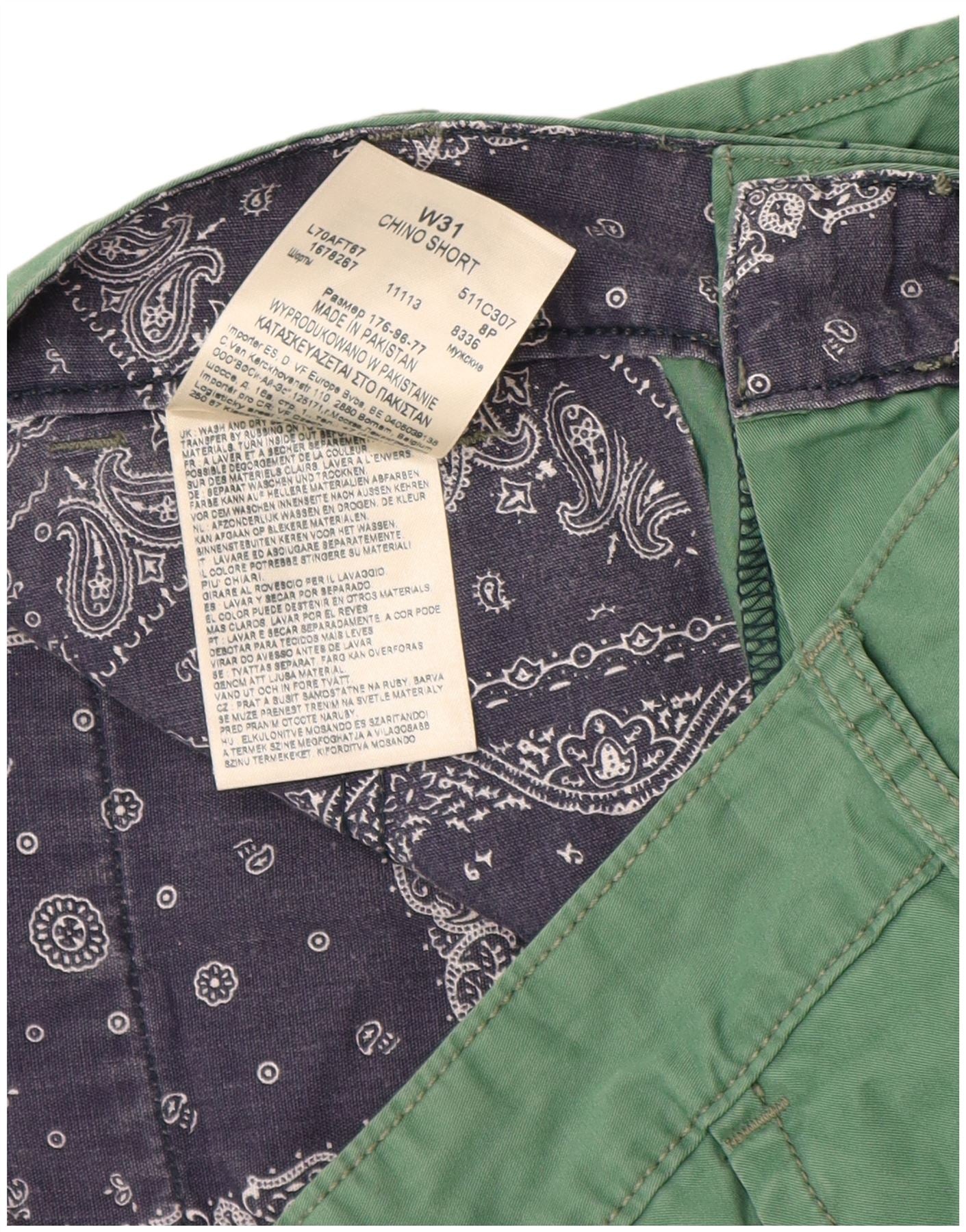 - AI Description: These Lee mens Chino Shorts are crafted from 100 percent woven cotton in a vibrant green hue. They feature a regular fit for comfortable wear. The button closure ensures a secure fastening. Practical pockets are included for convenience. The design is clean and unpatterned, offering versatile styling for various casual occasions.