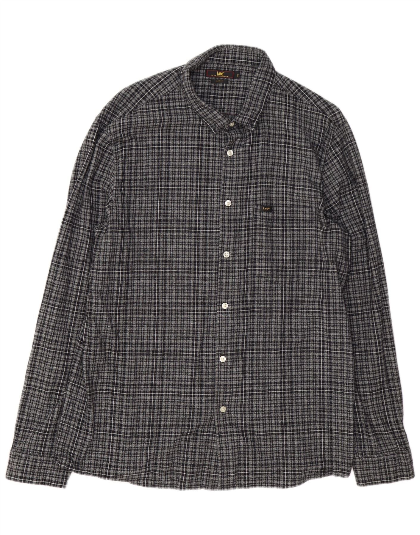 - AI Description: This Lee mens flannel shirt is crafted from soft 100 percent cotton flannel. It features a classic black and grey check pattern. The collared neckline and full button-up front offer a timeless look. Long sleeves with buttoned cuffs and a slim fit create a tailored silhouette. A single chest pocket adds practical detail. This shirt combines comfort with smart casual style.