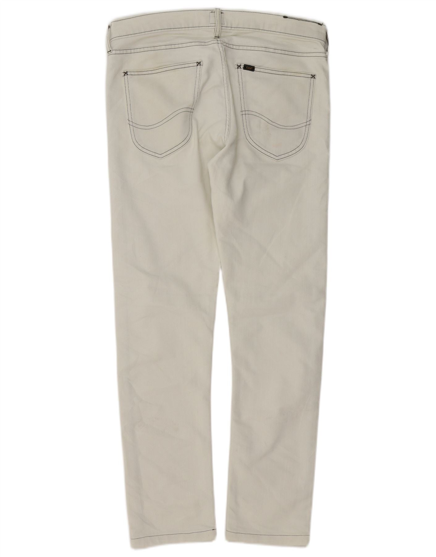 - AI Description: These Lee mens slim jeans are crafted from 100 percent cotton denim in an off white shade. They feature a classic slim fit with a button closure. The design includes functional pockets. Subtle dark stitching provides a striking contrast. A discreet brand logo adds a signature touch. The clean lines and contemporary cut offer versatile styling for any casual look.