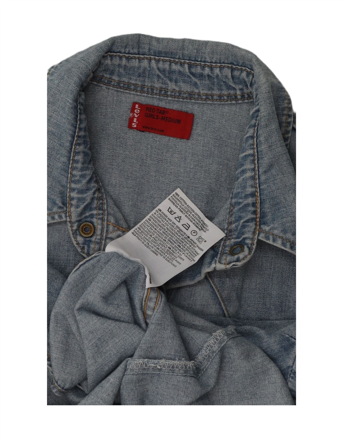 - AI Description: This Levi's girls' denim shirt is crafted from durable blue cotton denim. It features a classic collared neckline and long sleeves. The slim fit offers a smart, tailored silhouette. Snap fastenings provide a distinctive Western touch. Functional pockets and a subtle logo accent complete the design.