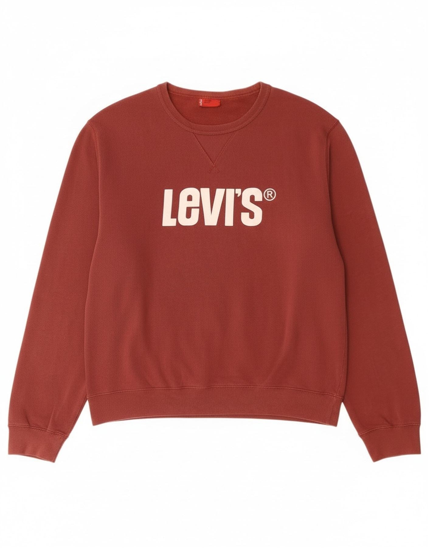- AI Description: This Levi's mens Sweatshirt Jumper is crafted from soft burgundy jersey fabric. It features a classic round neck and long sleeves. The regular fit ensures comfortable wear. Cuffed wrists and hem provide a neat finish. A prominent white Levi's graphic logo adorns the chest. This pullover design offers effortless style and comfort for everyday wear.