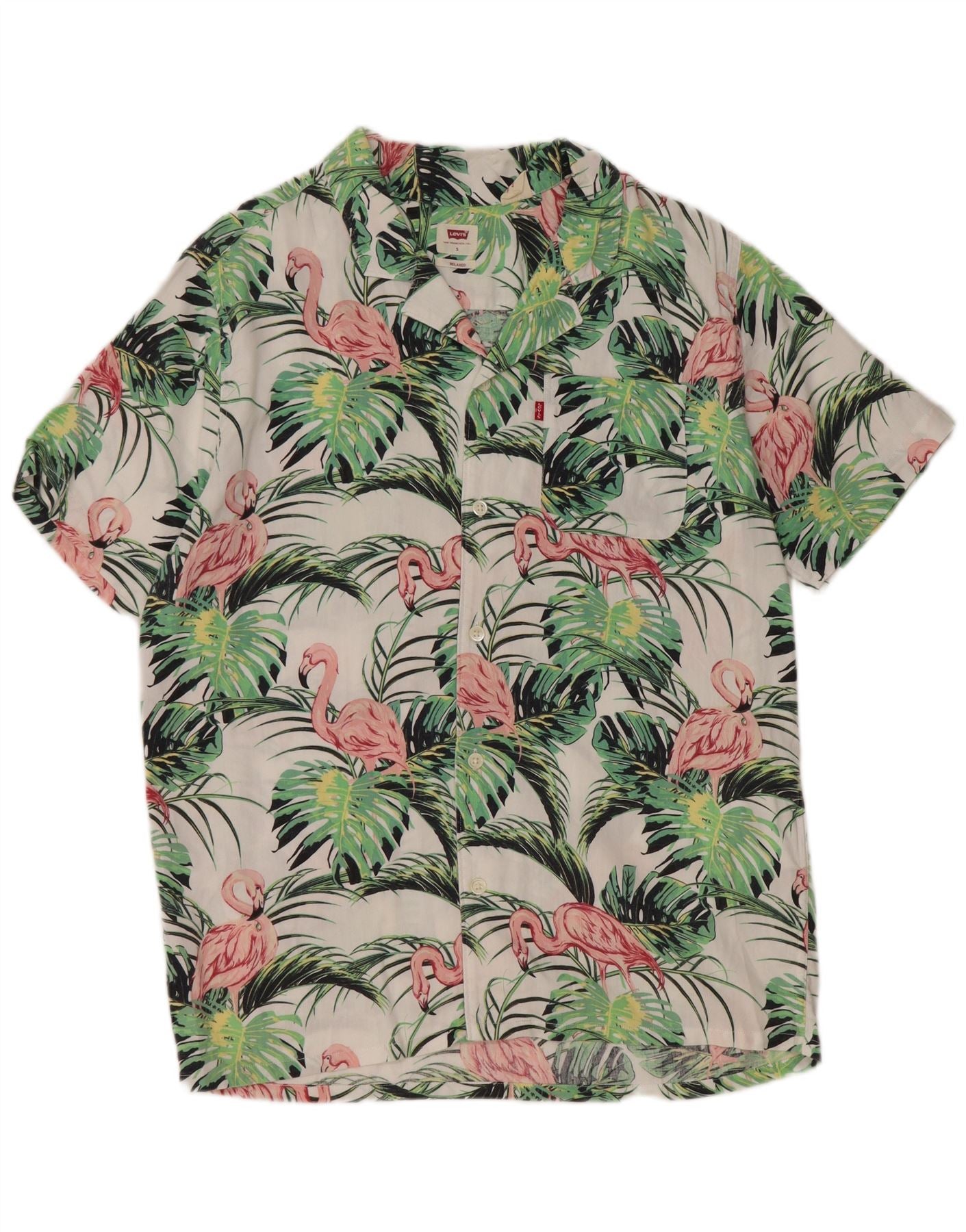 - AI Description: This Levi's men's shirt is crafted from a lightweight lyocell and cotton blend, offering a smooth, breathable feel. It features a vibrant multicoloured floral pattern with flamingos and tropical leaves. The collared neckline and button-up front provide a classic Hawaiian shirt look. Short sleeves and a relaxed fit ensure comfort and a laid-back style. A single chest pocket adds practical detail.