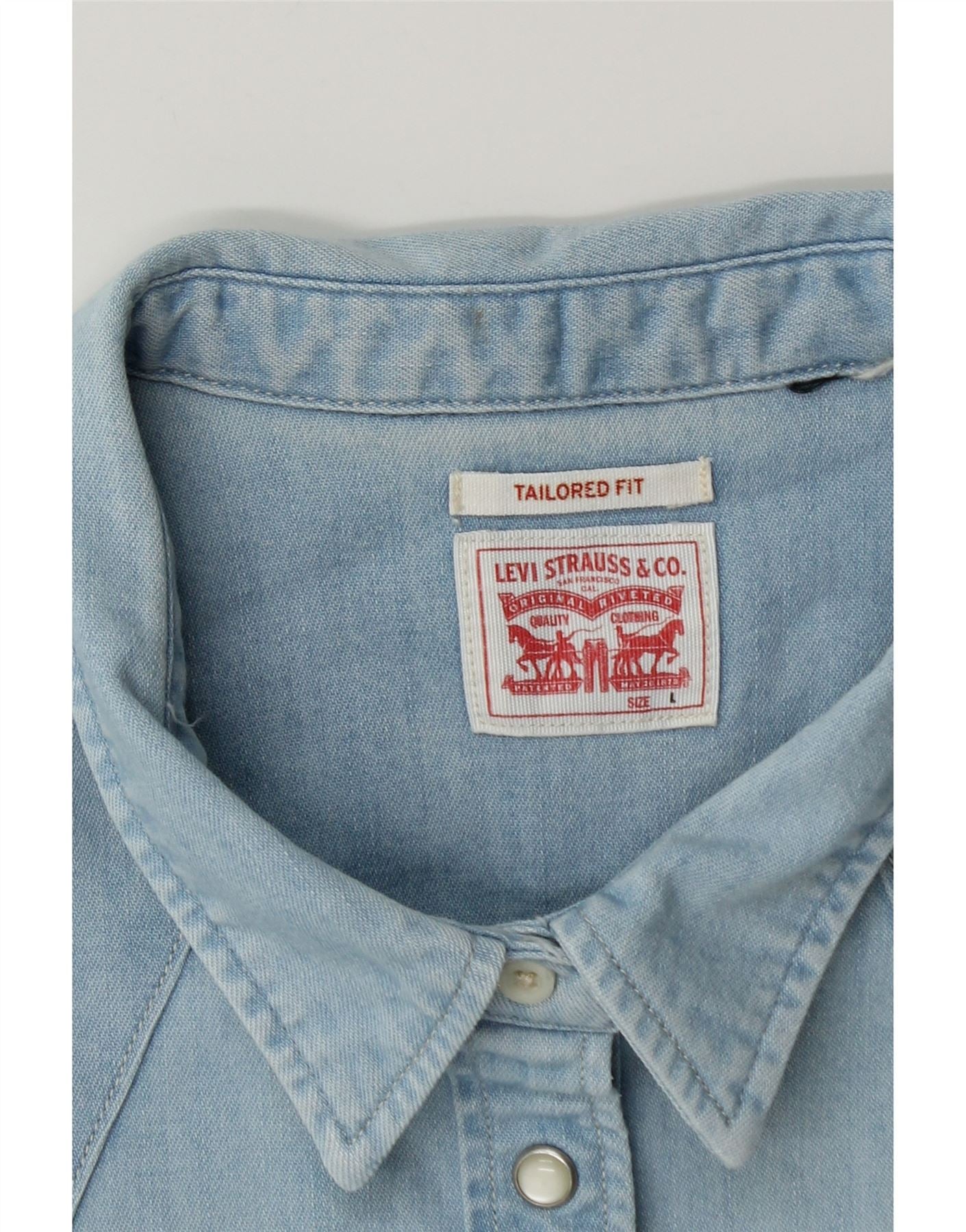 - AI Description: This Levi's women's denim shirt is crafted from light blue denim, offering a soft yet durable feel. It features a classic collared neckline and long sleeves with buttoned cuffs. The tailored fit provides a smart silhouette. Front button closure and chest pockets with button accents add authentic Western styling. The regular fit ensures comfortable wear.
