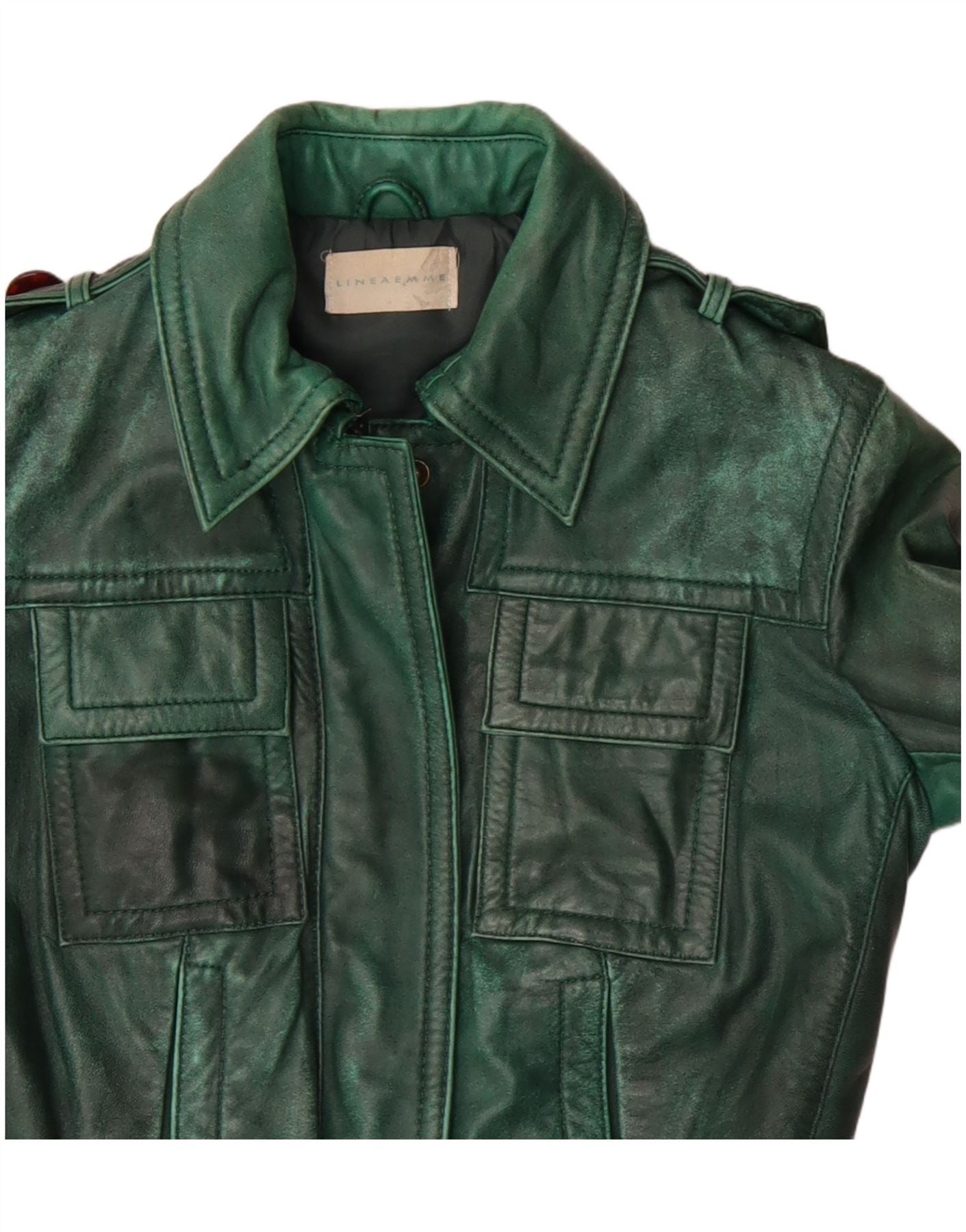 - AI Description: This Linea Emme womens leather jacket is presented in a rich green hue with a distinctive, textured finish. It features a classic collared neckline and a full zip closure. Long sleeves and a regular fit ensure comfortable wear. Multiple front flap pockets and button accents provide a utilitarian, military-inspired detail. The jacket is fully lined, offering both structure and comfort.