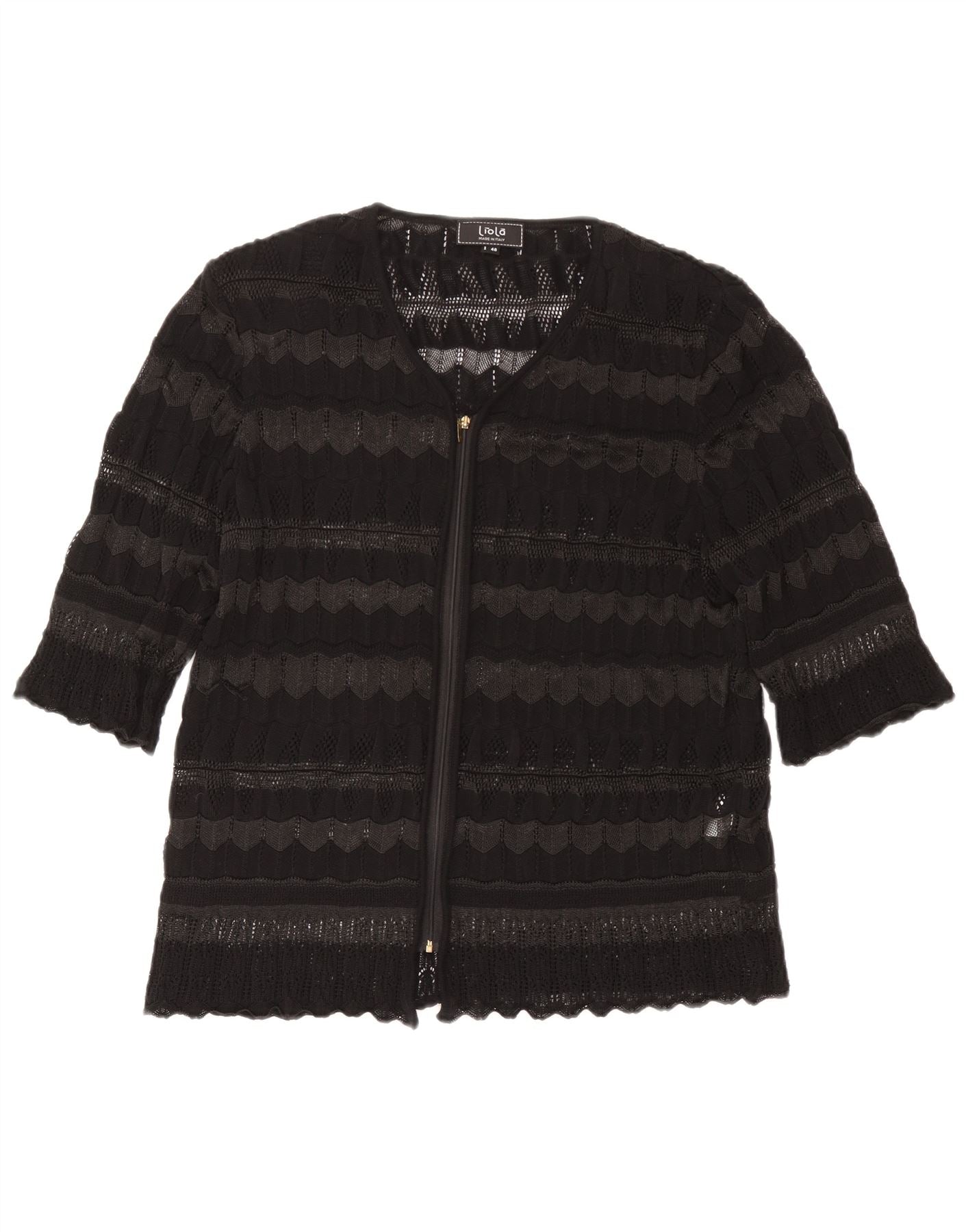 - AI Description: This Liola women's cardigan sweater is crafted from a black cotton blend knit, offering a comfortable texture. It features a classic V-neckline and practical full zip closure. The 3/4 length sleeves provide a versatile silhouette. A subtle geometric pattern adds visual interest, complemented by scalloped edges. The regular fit ensures comfortable wear, perfect for layering.