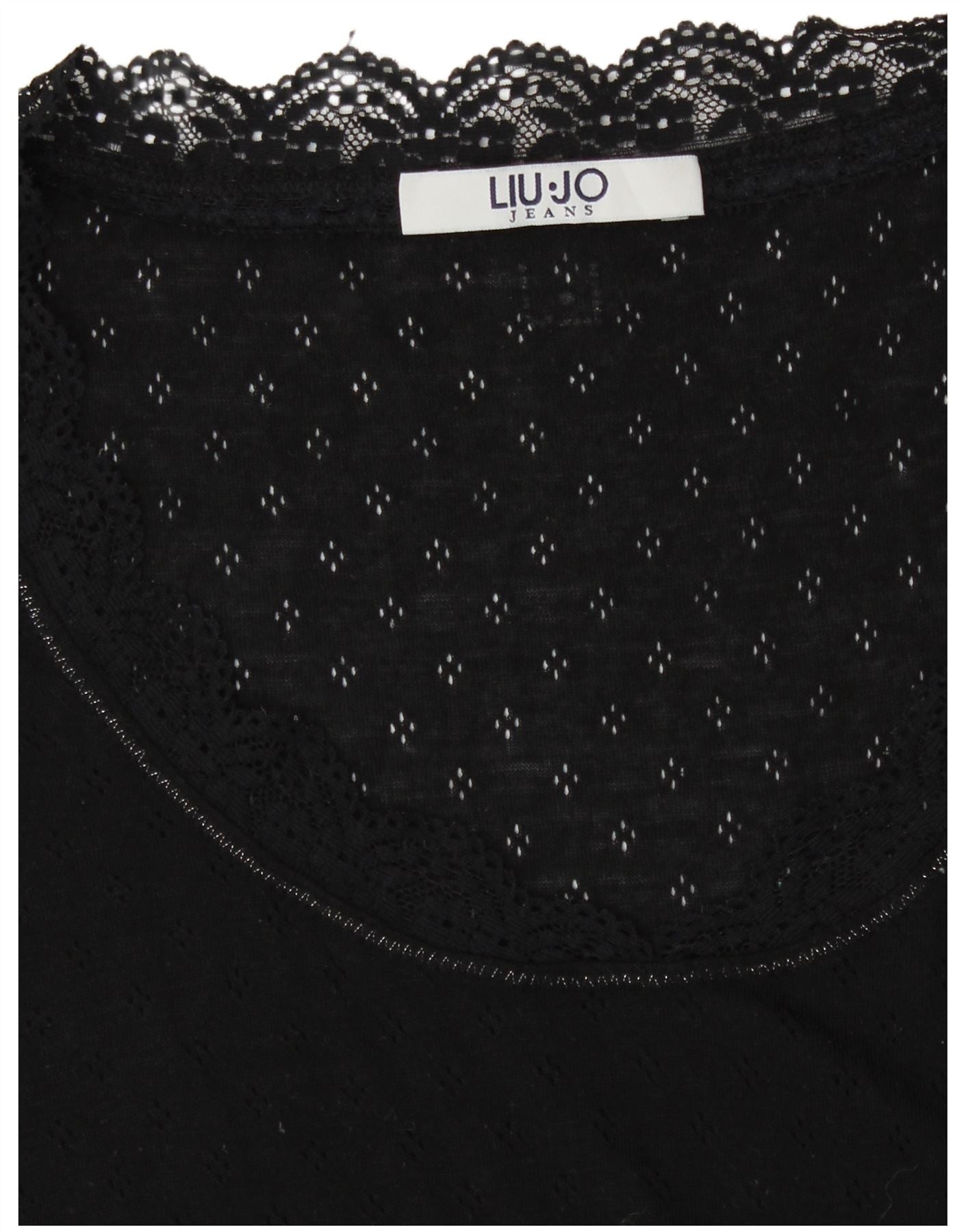 - AI Description: This Liu Jo womens T-shirt top is crafted from a soft black knit fabric. It features a delicate V-neckline, elegantly trimmed with fine lace detailing. The upper chest area showcases a subtle sheer panel with a dotted pattern, adding a touch of sophistication. Short sleeves and a regular fit ensure comfortable wear. This pullover design offers a refined yet versatile addition to any wardrobe.