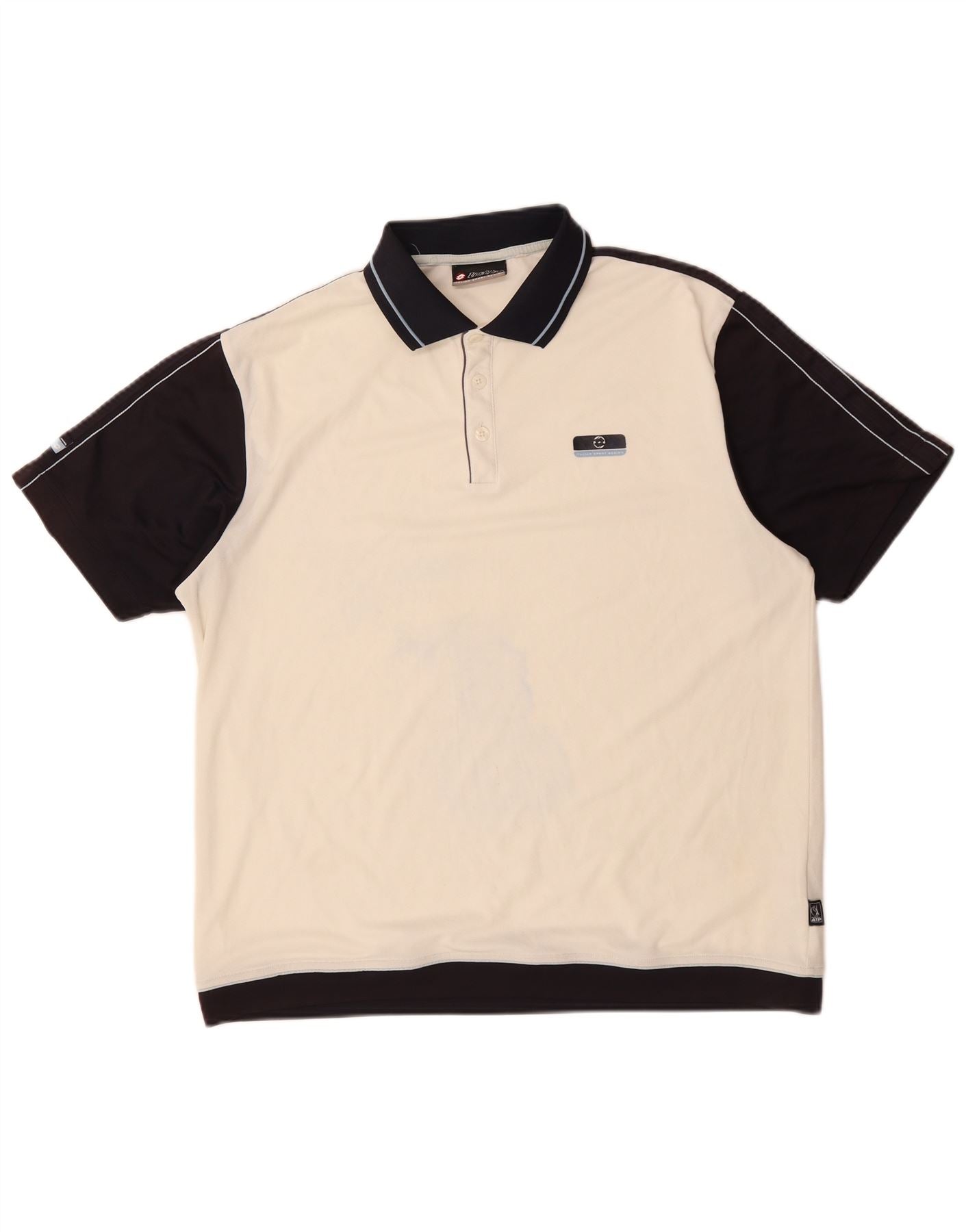 - AI Description: This Lotto mens Polo Shirt is crafted from a breathable, stretchy knit fabric. It features an off-white main body with contrasting black colourblock sleeves and hem. The collared neckline has a button closure. Short sleeves and a regular fit ensure comfort and ease of movement. A subtle logo accent completes the sporty design, perfect for active wear.