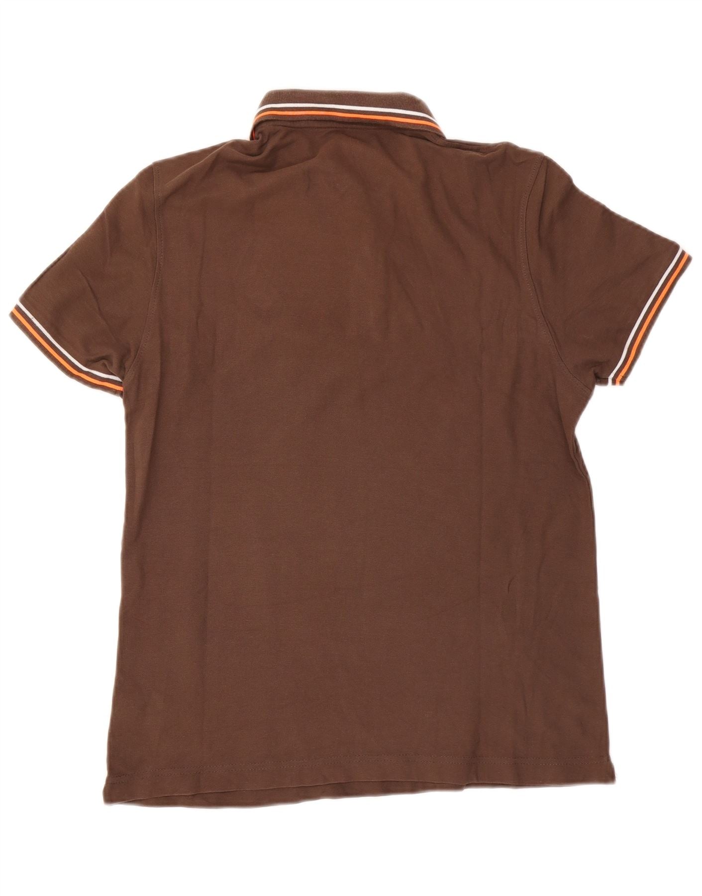 - AI Description: This Lotto mens Polo Shirt is crafted from soft 100 percent cotton knit fabric in a rich brown hue. It features a classic collared neckline with distinctive orange and white stripes. The short sleeves also boast matching striped cuffs, adding a sporty touch. A three-button placket and an embroidered Lotto logo on the chest complete the design. The regular fit ensures comfortable wear for everyday style.