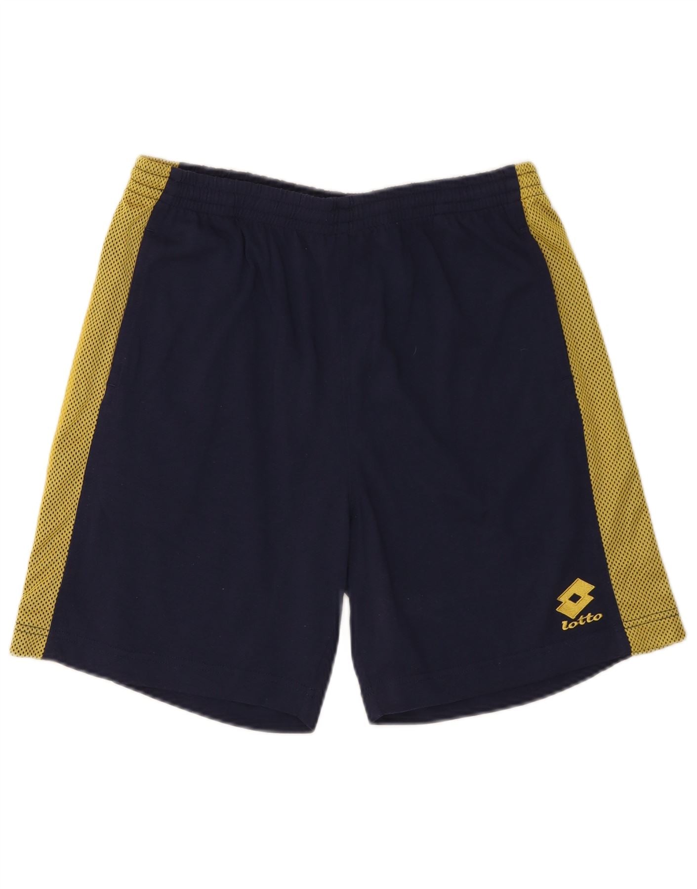 - AI Description: This Lotto mens shorts are crafted from lightweight, breathable navy blue mesh fabric. They feature a comfortable pull-on design with an athletic regular fit. Yellow side panels display a subtle geometric pattern, enhancing the sporty look. The Lotto logo is prominently placed. These performance shorts are ideal for sport.