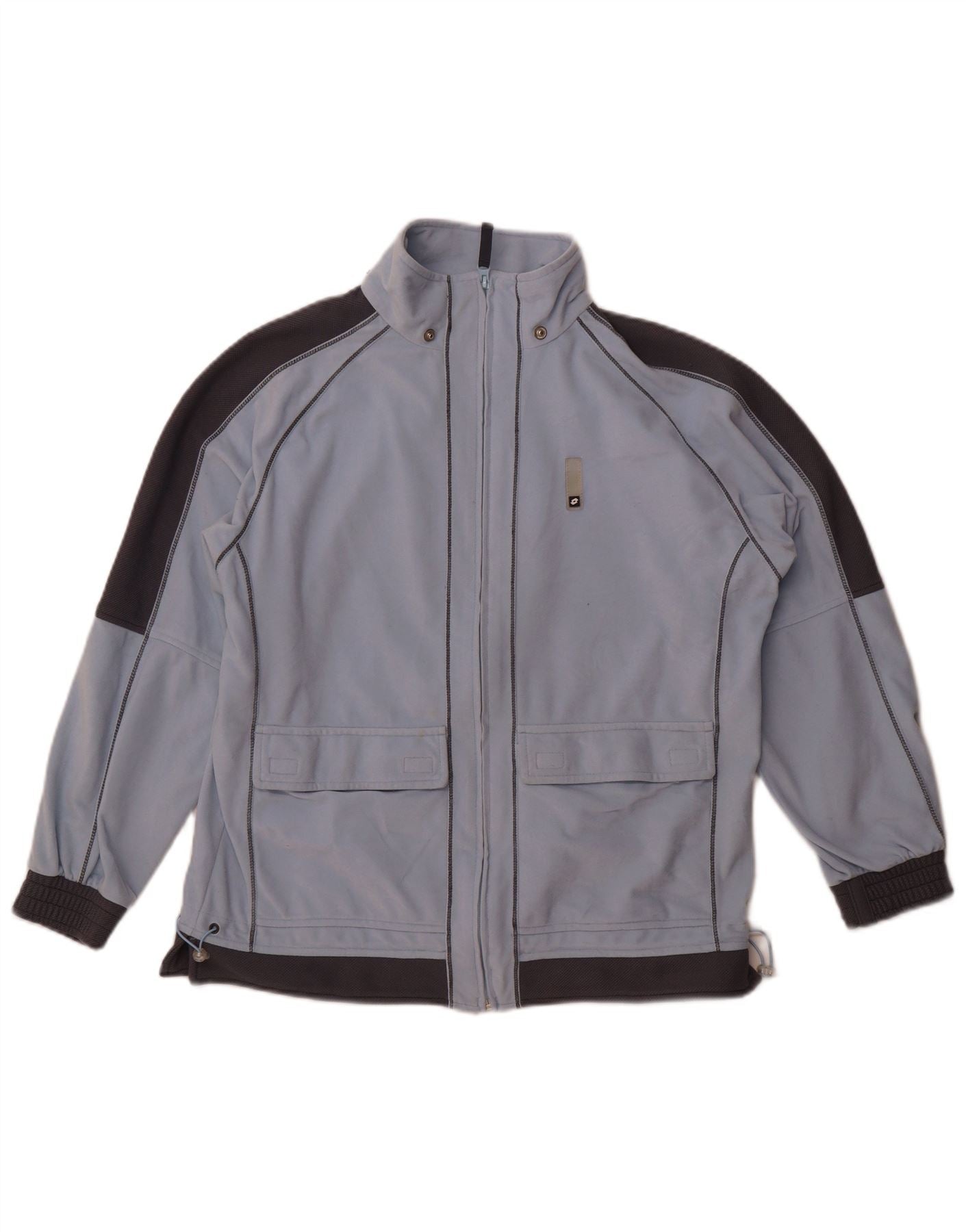 - AI Description: This Lotto mens fleece jacket is crafted from soft fleece jersey fabric in a striking light blue and dark grey colourblock design. It features a practical full zip closure and a smart collared neckline. Long sleeves and a regular fit ensure comfortable wear. Two front pockets add functionality. A subtle brand logo provides a signature accent.