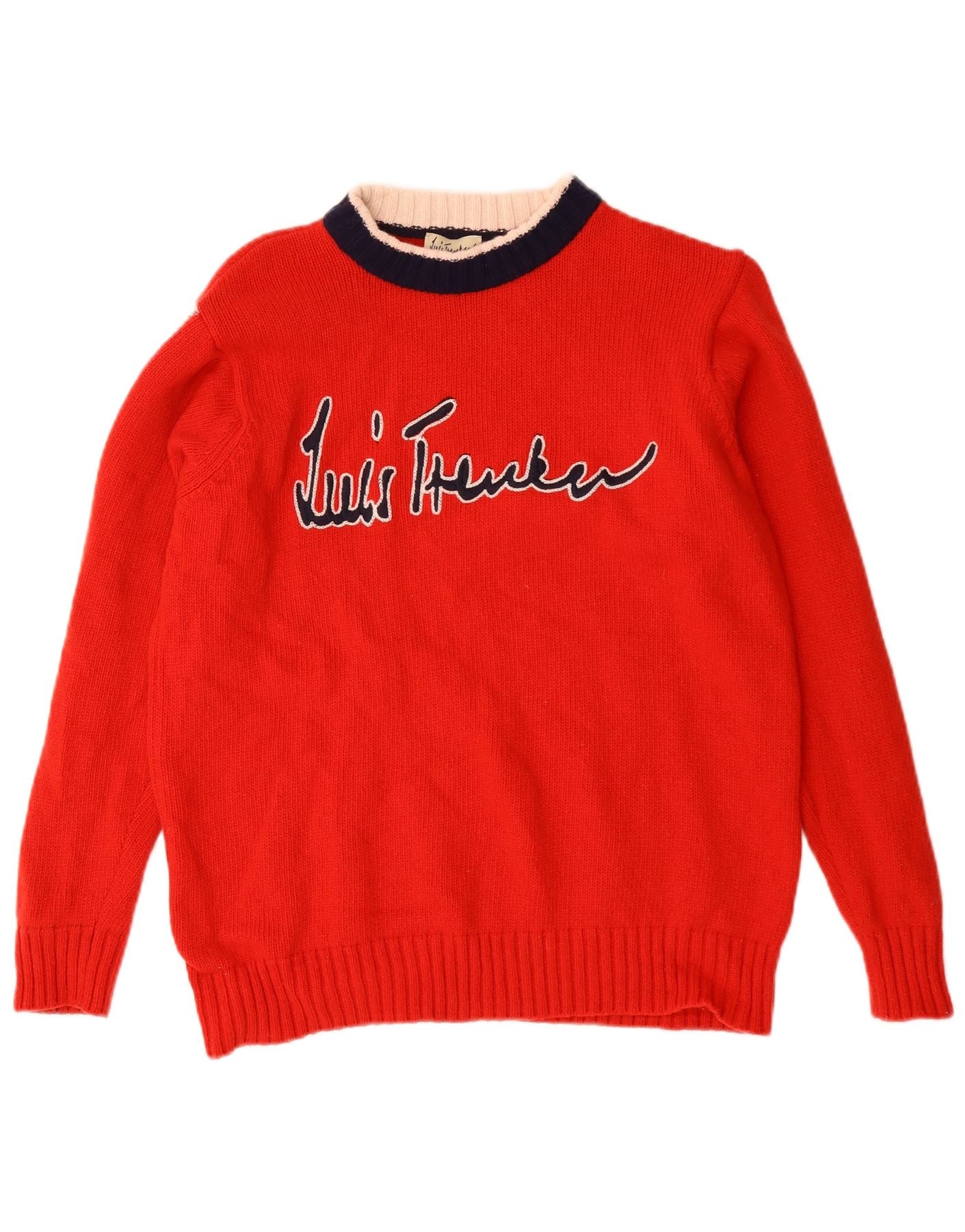 - AI Description: This Luis Trenker womens crew neck jumper sweater is crafted from 100 percent wool knit, offering warmth and comfort. Its vibrant red hue is complemented by a contrasting round neckline. The long sleeves and regular fit ensure a classic, comfortable silhouette. A distinctive graphic logo across the chest adds a signature touch to this stylish pullover.