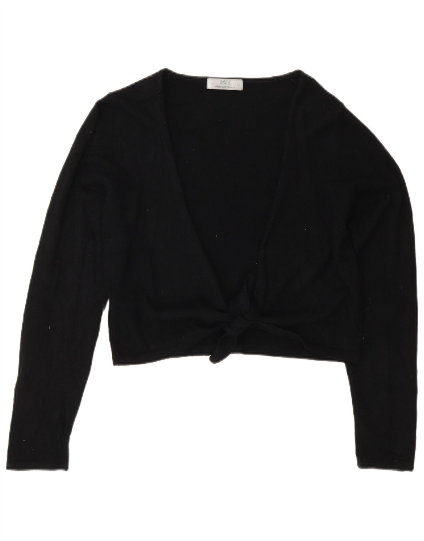 - AI Description: This Marks & Spencer womens bolero jumper is crafted from luxurious black cashmere knit, offering a lightweight and comfortable feel. It features a classic V-neckline and long sleeves. The cropped bolero fit creates a stylish silhouette. A front tie closure allows for versatile styling, forming a subtle bow accent. This regular fit piece is perfect for layering, adding a touch of classic elegance.