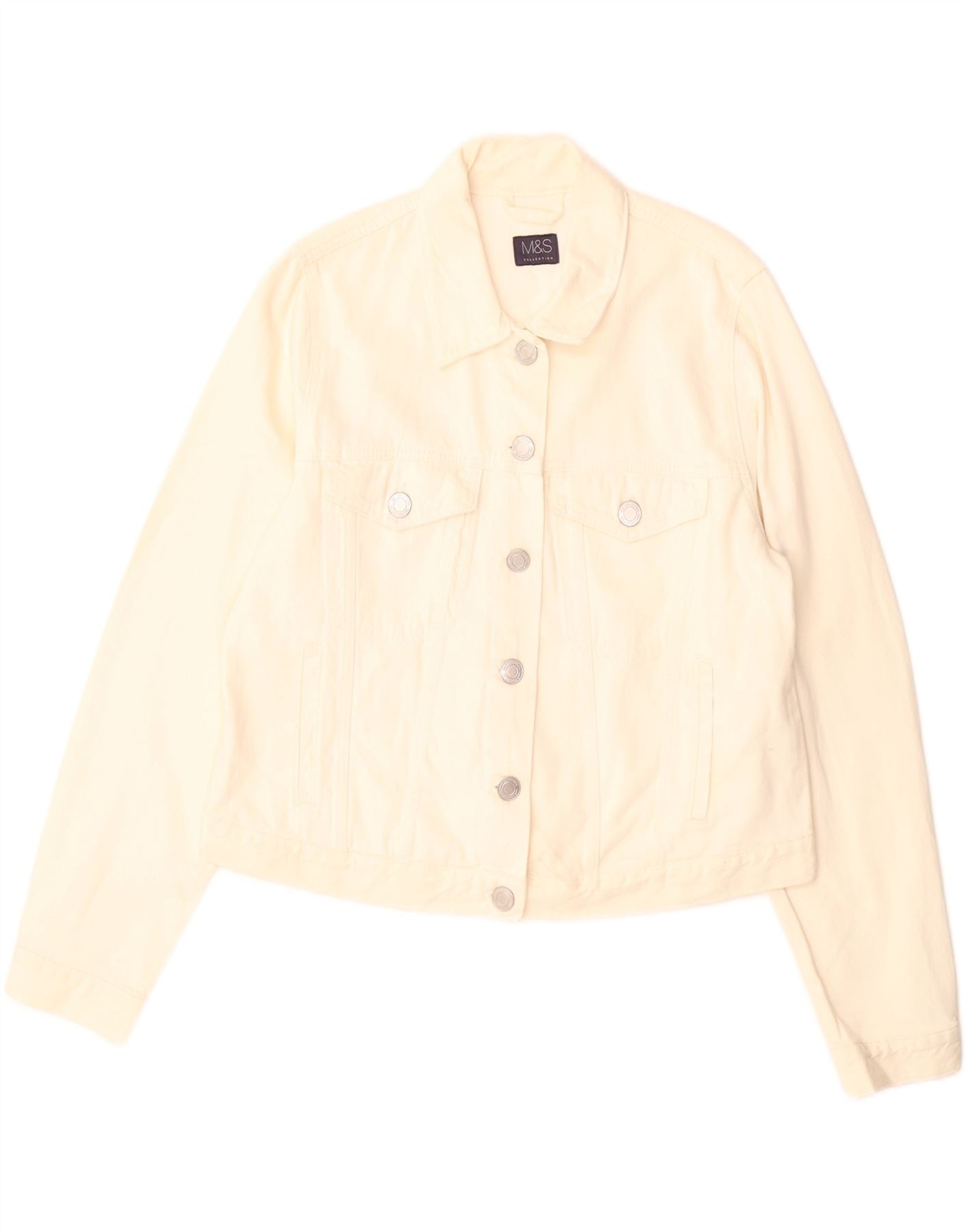 - AI Description: This Marks & Spencer womens denim jacket is crafted from pure cotton denim in a versatile off white shade. It features a classic collared neckline and long sleeves. The front is secured with a full button closure. Practical pockets add functional detail. Its regular fit ensures comfortable wear, making it a timeless wardrobe staple.