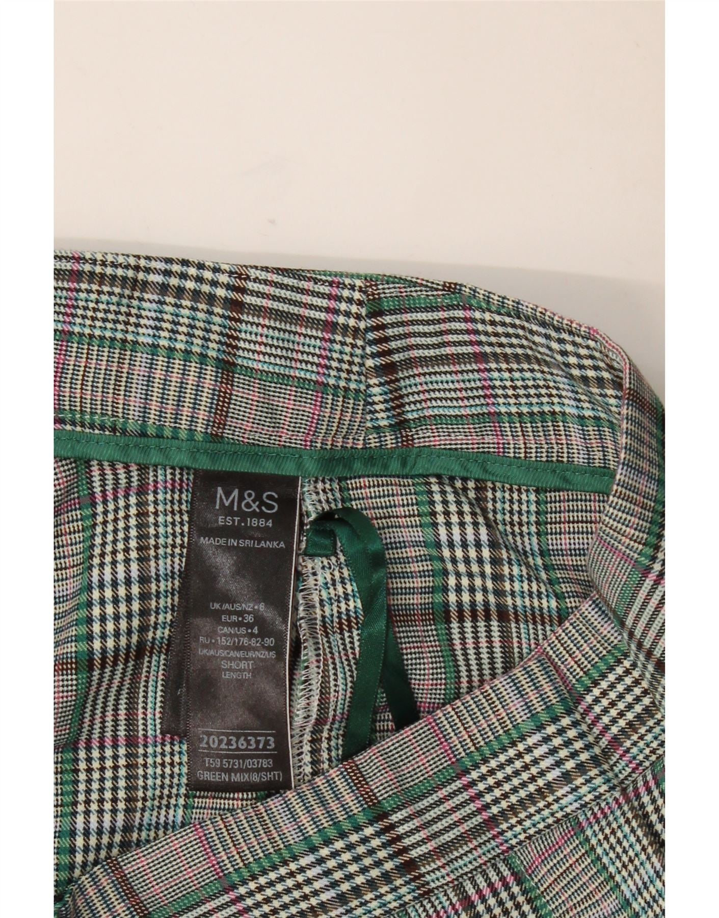 - AI Description: These Marks & Spencer womens cropped trousers are crafted from a woven fabric with a smooth finish. They feature a classic plaid pattern in a sophisticated multicoloured blend of grey, green, and black. The mid-rise waist includes an elasticated pull-on design for comfort and ease. A regular fit ensures a comfortable silhouette. The cropped length offers a modern, versatile style, perfect for smart casual wear.