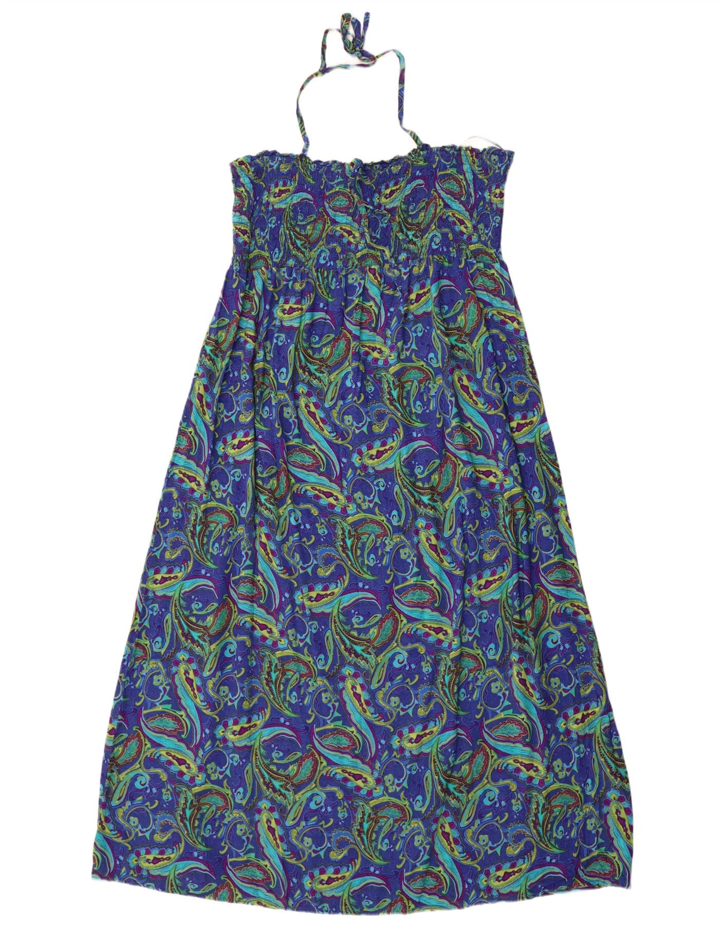 - AI Description: This Marks & Spencer womens halter dress is crafted from lightweight 100 percent viscose, offering a soft, flowing texture. It features a vibrant blue paisley pattern with an abstract design. The sleeveless halter neckline ties at the back, complementing the elasticated, pleated bodice. A relaxed fit ensures comfort, making it an ideal pull-on style for warm weather. The bohemian aesthetic is enhanced by its fluid drape.