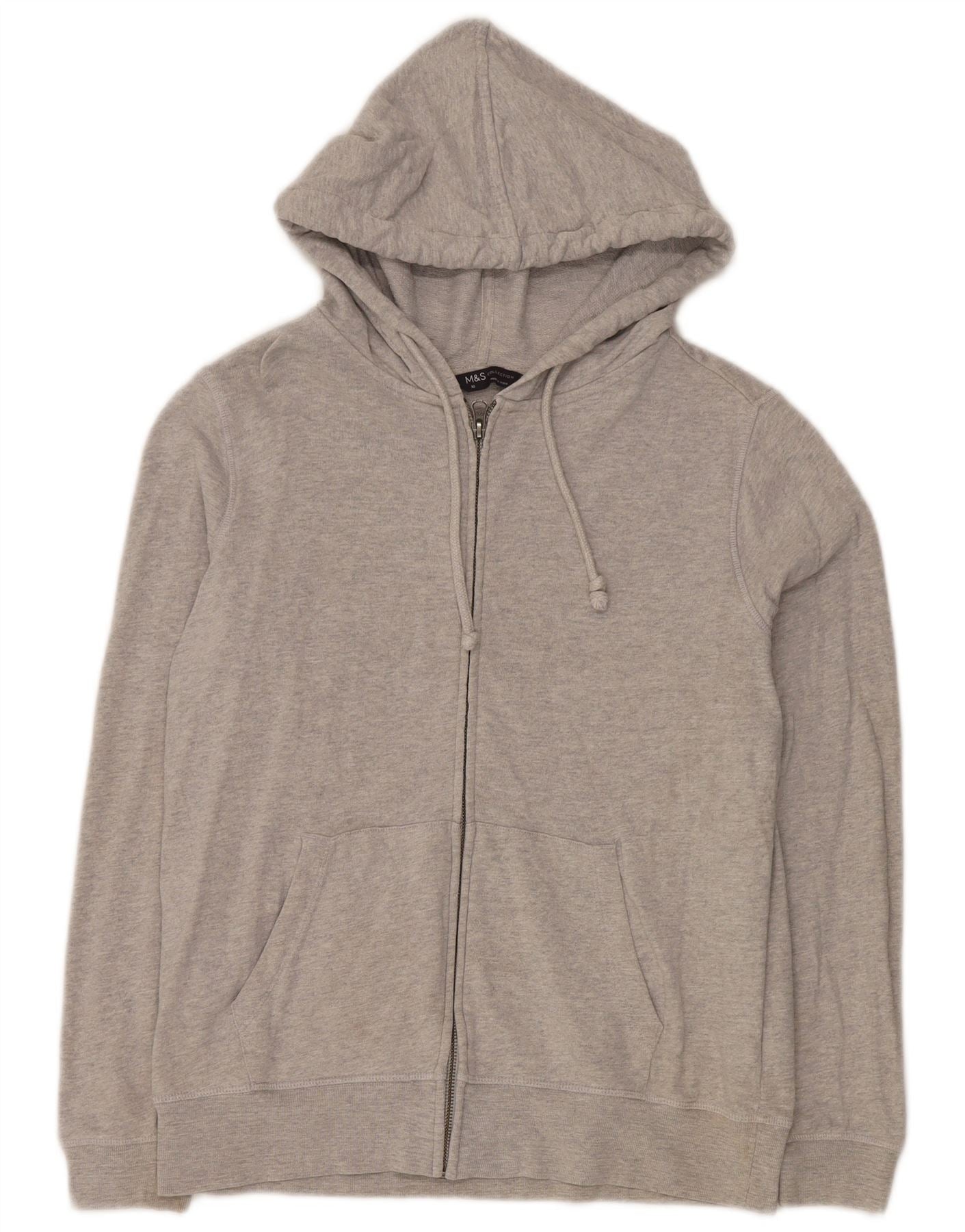 - AI Description: This Marks Spencer womens Zip Hoodie Sweater is crafted from soft grey flecked cotton jersey. It features a full zip closure and a comfortable hooded design. Long sleeves and a regular fit ensure ease of wear. Practical front pockets add functionality. The classic style offers versatile layering for everyday comfort.