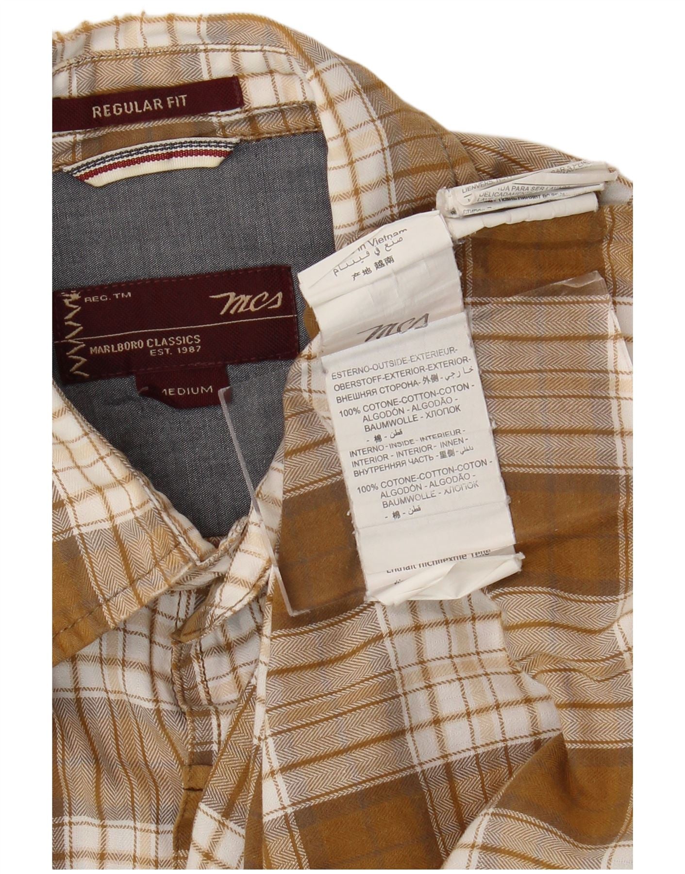 MARLBORO CLASSICS Mens Regular Fit Flannel Shirt Medium Beige Check Cotton