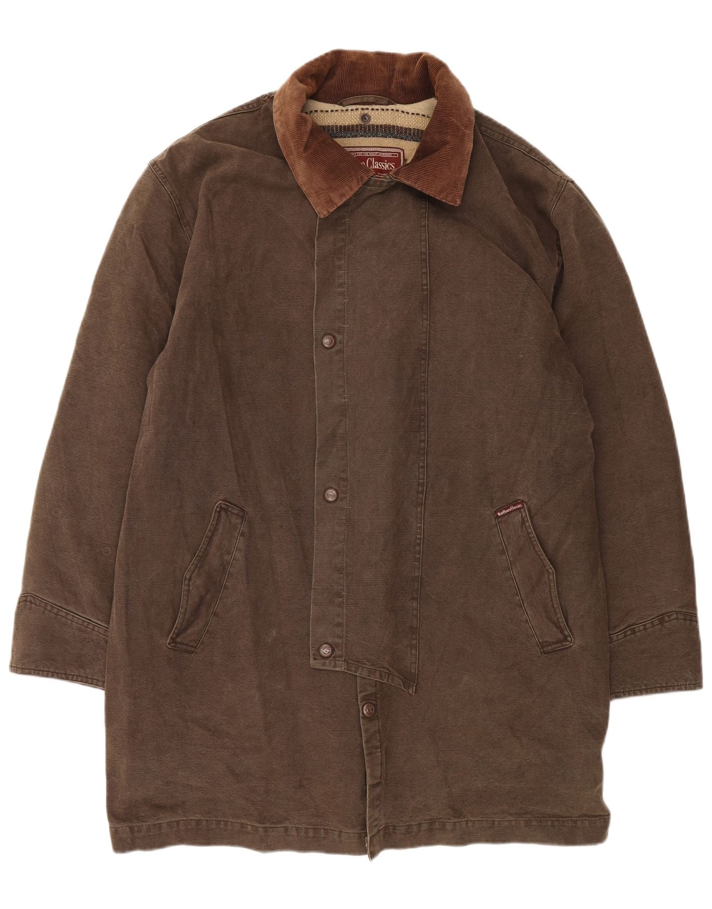 - AI Description: This Marlboro Classics mens utility jacket is crafted from robust brown canvas, offering a durable yet comfortable feel. It features a contrasting corduroy collar for added texture. The long sleeves and regular fit provide a classic silhouette. A collared neckline enhances its traditional utility style. It fastens with a four-button closure down the front. Practical pockets are integrated into the design, adding functionality. The button accents complete the classic aesthetic.