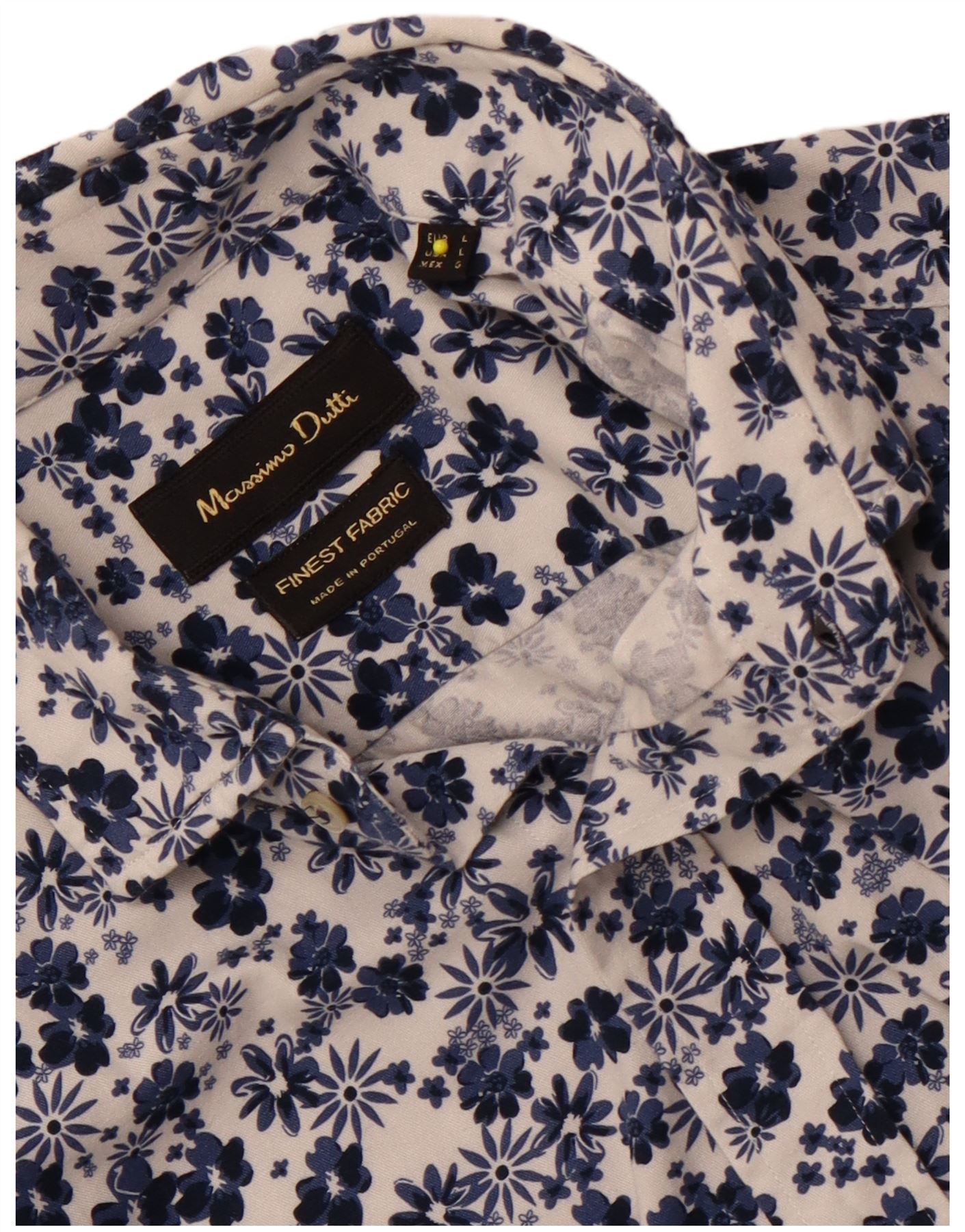- AI Description: This Massimo Dutti mens shirt is crafted from a crisp white woven fabric. It features a vibrant blue floral pattern throughout. The collared neckline and full button-up front offer a classic look. Long sleeves finish with neat cuffs. A regular fit ensures comfortable wear. This shirt combines traditional tailoring with a fresh, eye-catching design.