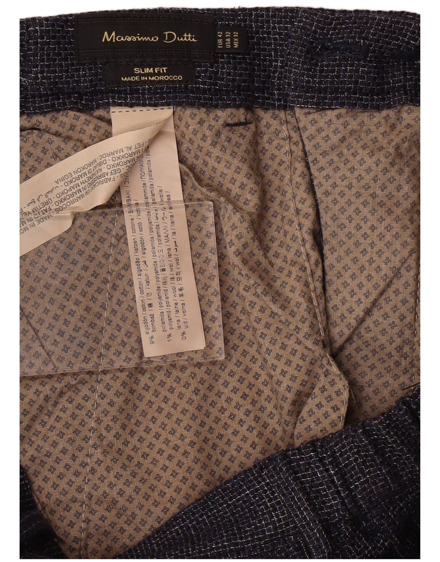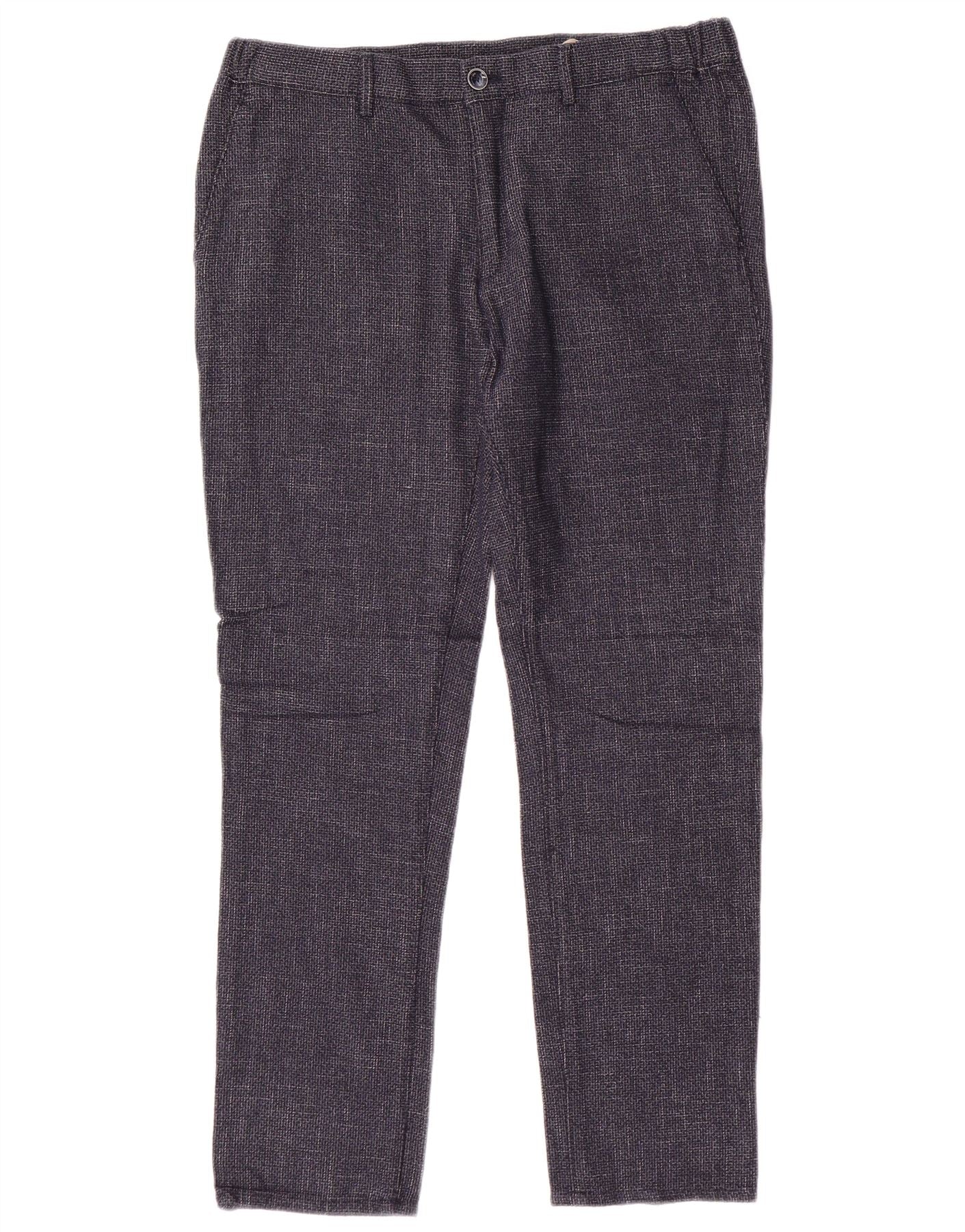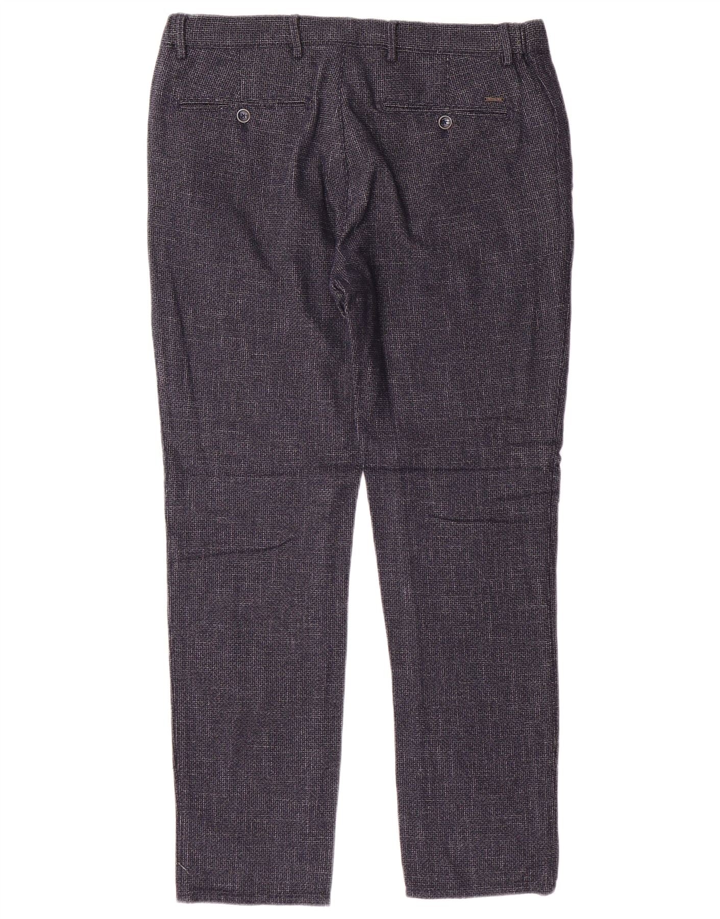 - AI Description: These Massimo Dutti mens trousers are crafted from a grey flecked cotton blend. They offer a subtle texture and comfortable stretch. The slim fit tapers neatly through the leg for a modern silhouette. A button and zip closure secures the front. Classic pockets add practicality. The woven fabric ensures a smart, refined appearance.